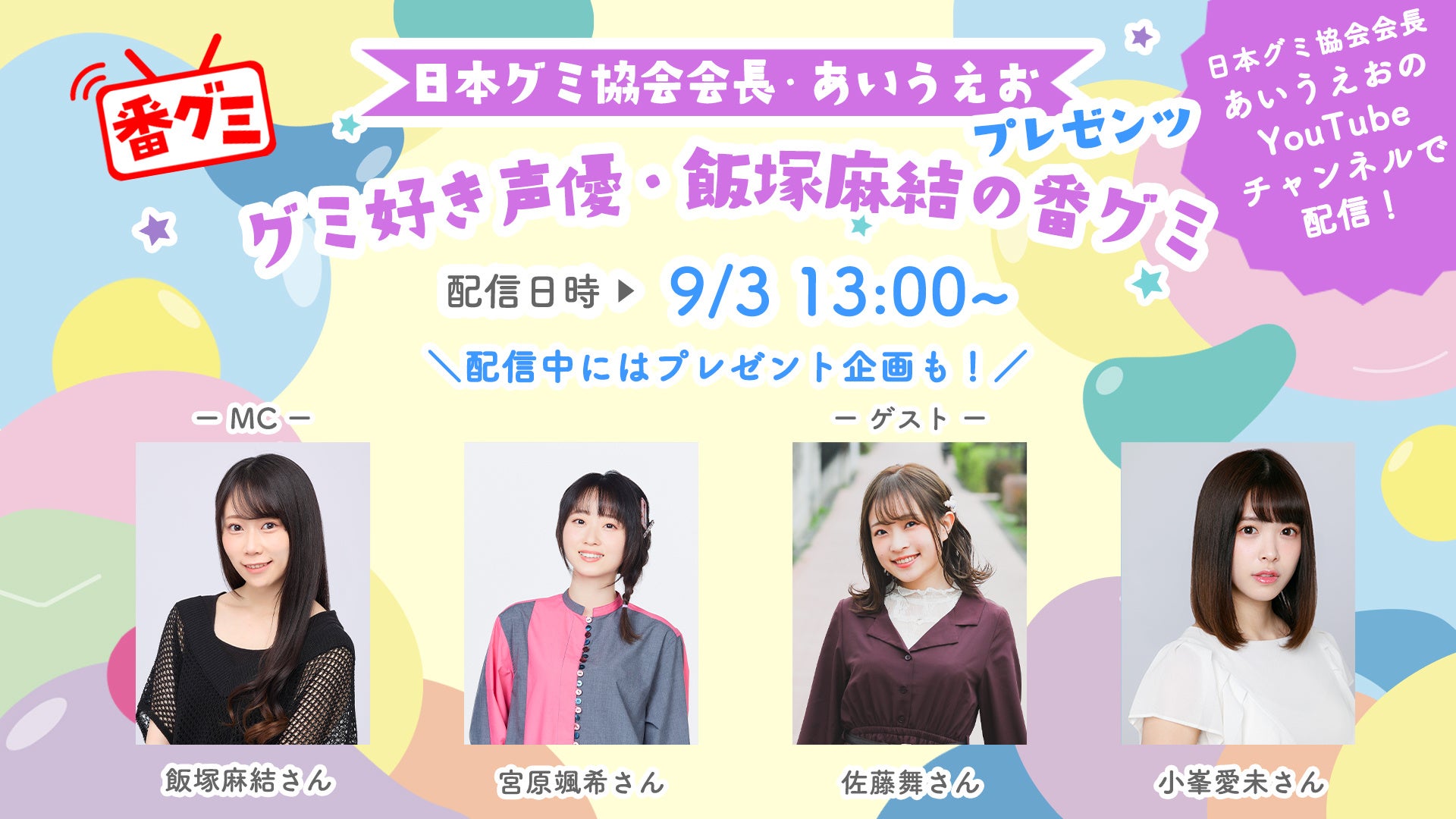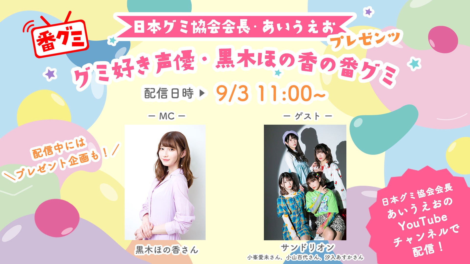 日本グミ協会公認でグミに詳しい、声優の黒木ほの香さんと、飯塚麻結さんがMCを務める番組を配信します。番組は9月3日の11時と13時の2回にわたり、日本グミ協会会長のYouTube『あいうえおのグミチャンネル』で配信されます。