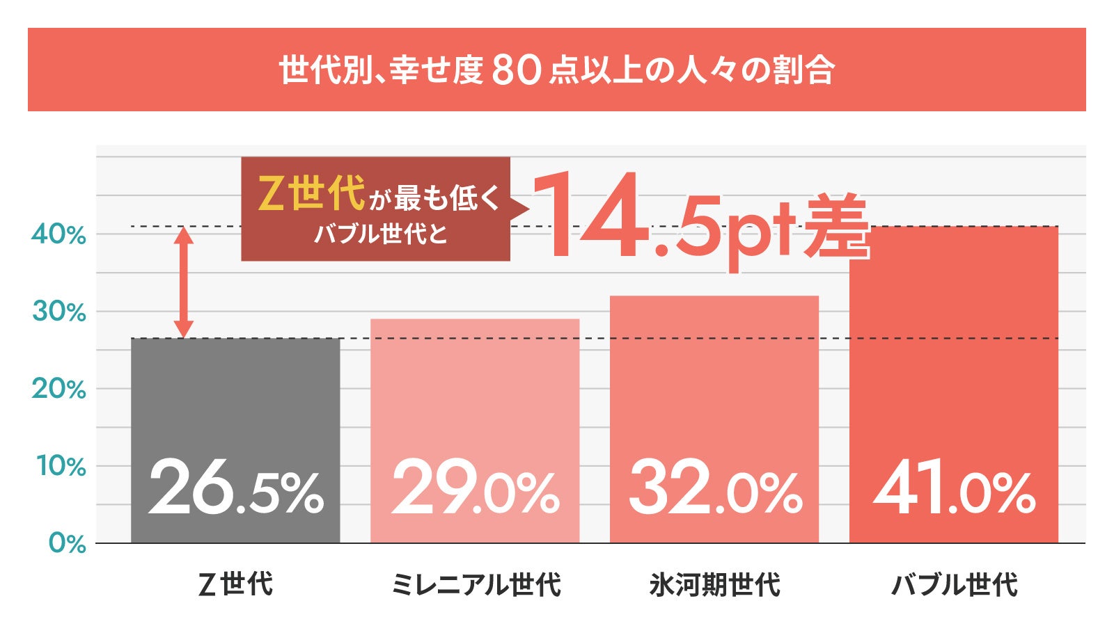 若い世代ほど「仕事に対する幸せ度」が低く、Z世代は[26.5%]、片やバブル世代は[41.0%]