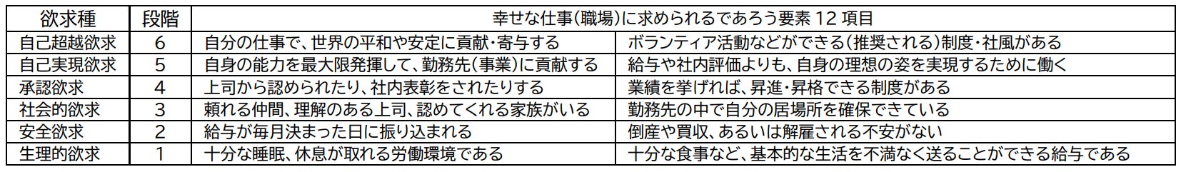 このことから、現代における”幸せな仕事“(職場)を「マズローの6段階欲求説」に基づいて定義すると【生理的欲求:段階1】、【安全的欲求:段階2】が満たされていることが前提に、さらに【社会的欲求:段階3】が満たされているか否かがポイントとなることが分かった。