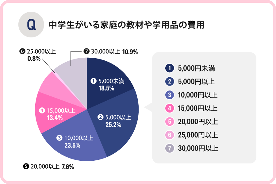 これは、小学生の教材・学用品の費用10,000円以下の約65%に比べ、2割ほど少ない結果となっています。