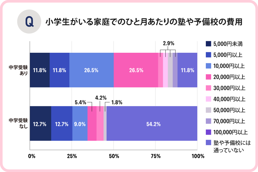 一方、中学受験をしない家庭では、5,000円未満と10,000円以下の家庭が各12.7%と最も多く、中学受験をするかしないかで塾代が大きく異なることが分かりました。