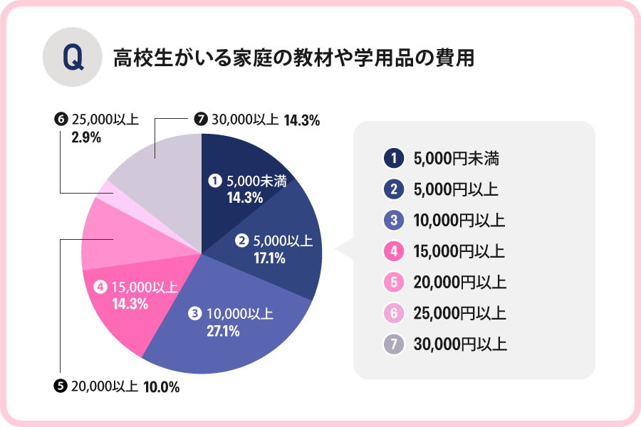 高校生がいる家庭では、ひと月の教材や学用品の費用が10,000円以下の割合はさらに減少し、約3割に。