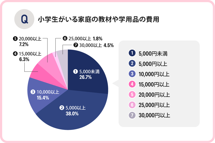 小学生がいる家庭では、ひと月あたりの教材や学用品の費用は5,000円以上10,000円以下が最も多く、38.0%となりました。