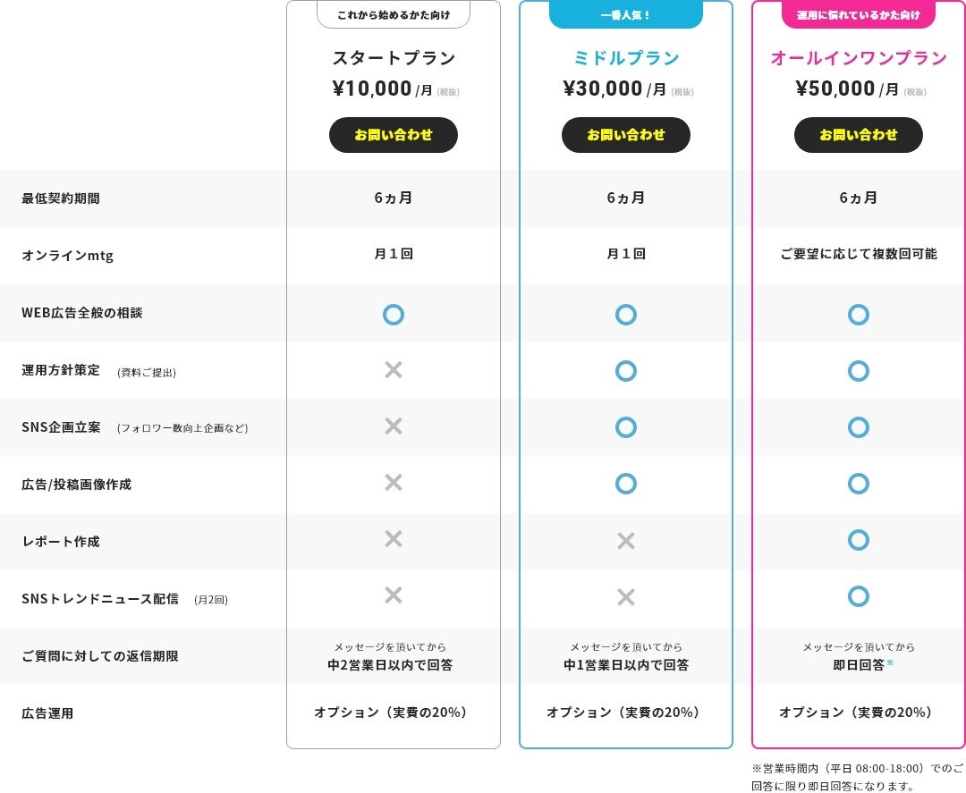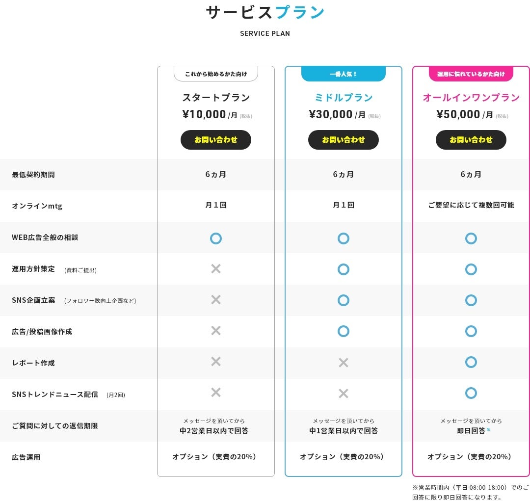 本サービスの背景には弊社がSNS・WEBマーケティング運用代行サービスをご提供していく中で、より多くの企業様に施策の重要性を知って頂きたいという想いがあり、低価格帯のコンサルティングサービスを構築致しました。