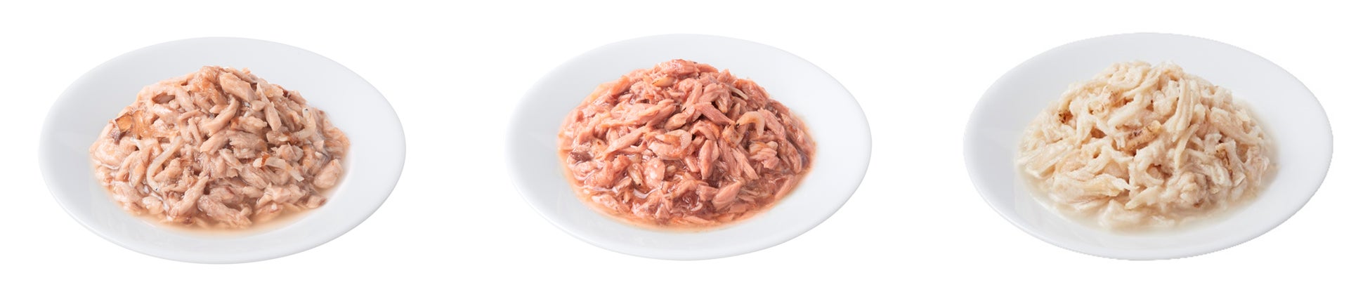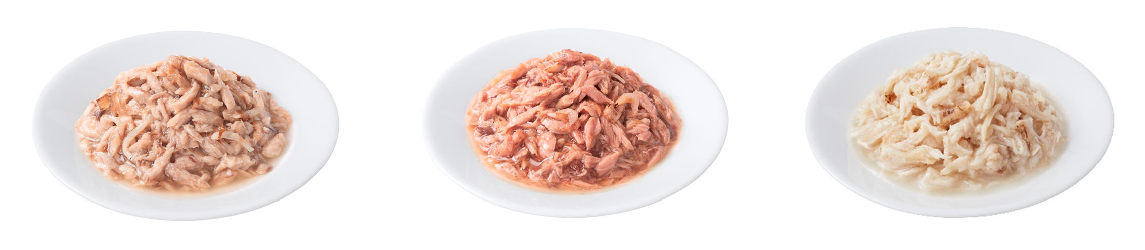様々な具材やエキスを配合し、旨みと香りが引き立つこだわりのメニュー3種でお届けします。共通して、増粘剤・調味料・着色料・発色剤不使用で、小さめのフレークにでん粉でとろみをつけて食べやすく仕上げました。