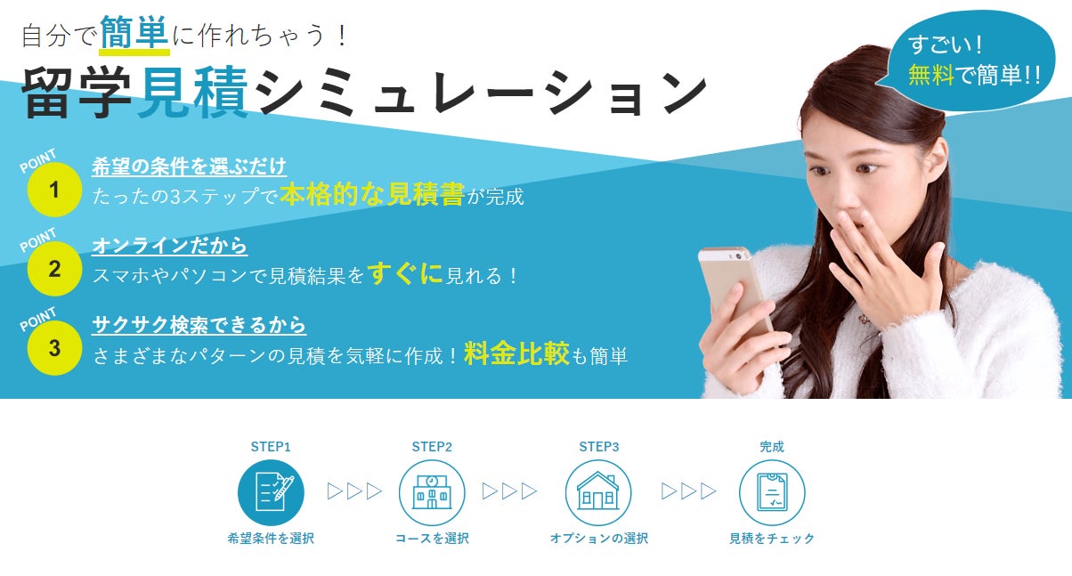 留学費用シミュレーションは、オンライン上でいつでもどこでも語学留学やワーキングホリデーの費用を無料かつ会員登録不要で作成可能とするオンラインサービスです。対象の国は、英語圏の留学先として人気の6カ国(アメリカ・イギリス・オーストラリア・カナダ・ニュージーランド・カナダ)となり、対象の国は順次拡充される予定です。