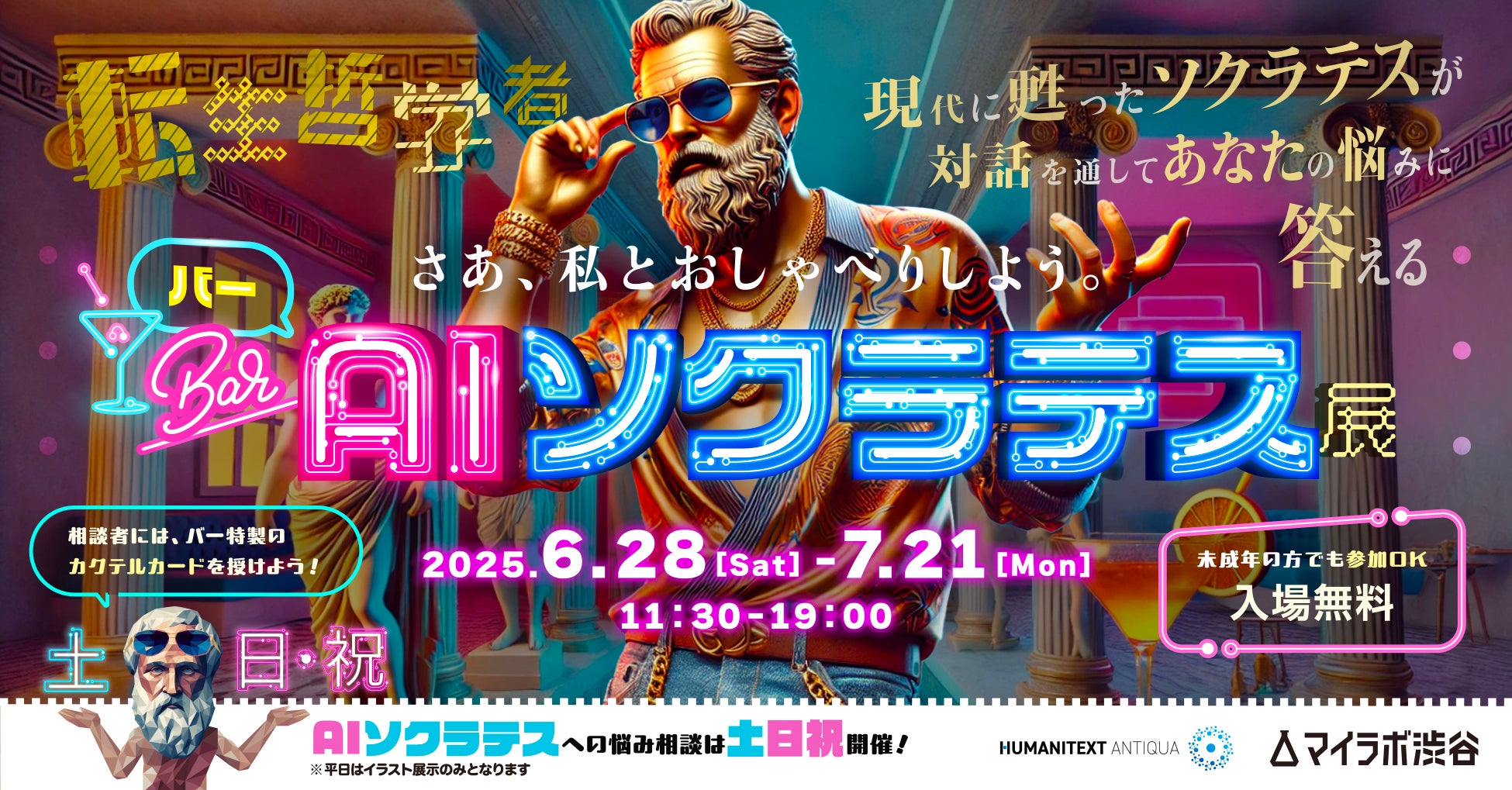 株式会社ディレクションズ(本社:東京都渋谷区、代表:岩切謙太郎)は、ヒューマニテクスト開発チーム(名古屋大学デジタル人文社会科学研究センター 准教授 岩田 直也、桜美林大学 リベラルアーツ学群 准教授 田中 一孝、東京大学人文社会系研究科附属次世代人文学開発センター 小川潤 助教)と協力して、2025年6月28日(土)から7月21日(月祝)までマイラボ渋谷にて、「BAR・AIソクラテス展」を開催致します。本展では、AI技術によって現代の渋谷に舞い降りた哲学者ソクラテスと音声で対話し、その内容を反映したオリジナルの“カクテルカード”を生成するという、ユニークな体験を提供します。