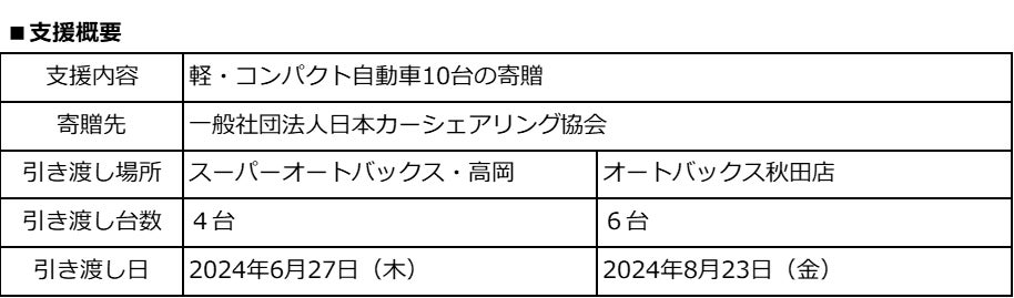 株式会社オートバックスセブン(代表取締役 社長:堀井勇吾、以下「当社」)は、被災地でクルマを失った方などに無償で貸し出しを行っている一般社団法人日本カーシェアリング協会(代表理事:吉澤武彦、以下「日本カーシェアリング協会」)へ、車両10台(富山県にて4台/秋田県にて6台)を寄贈いたしました。