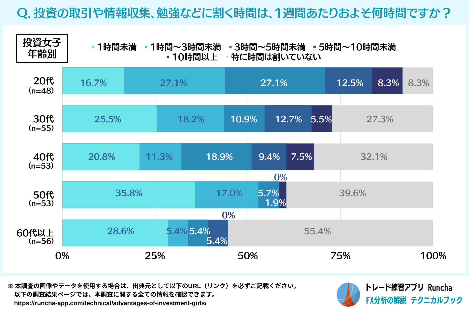 2.若い世代の投資女子ほど投資に割く時間が長い、20代は1週間あたり3時間以上の人が47.9%