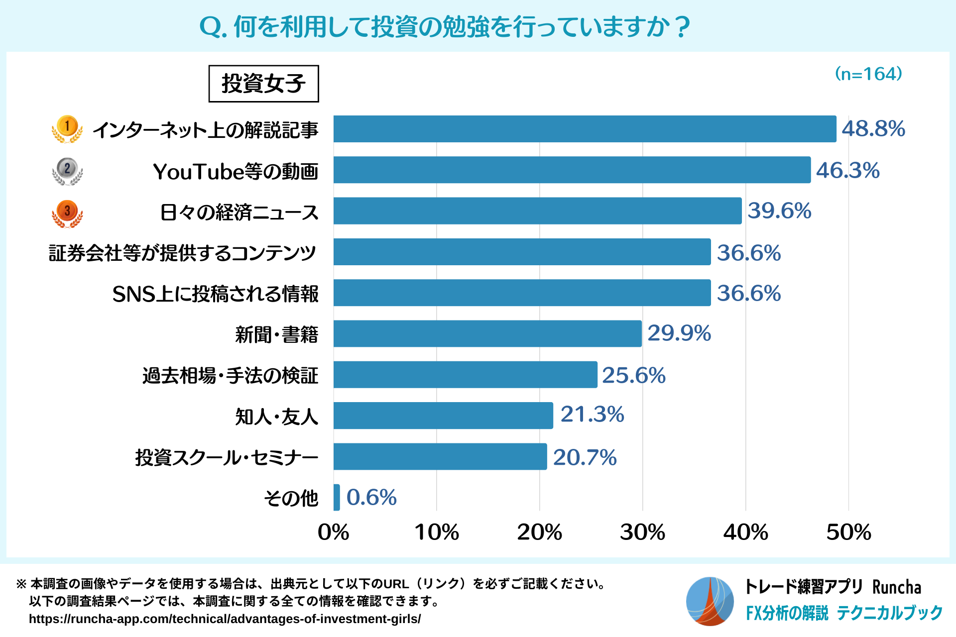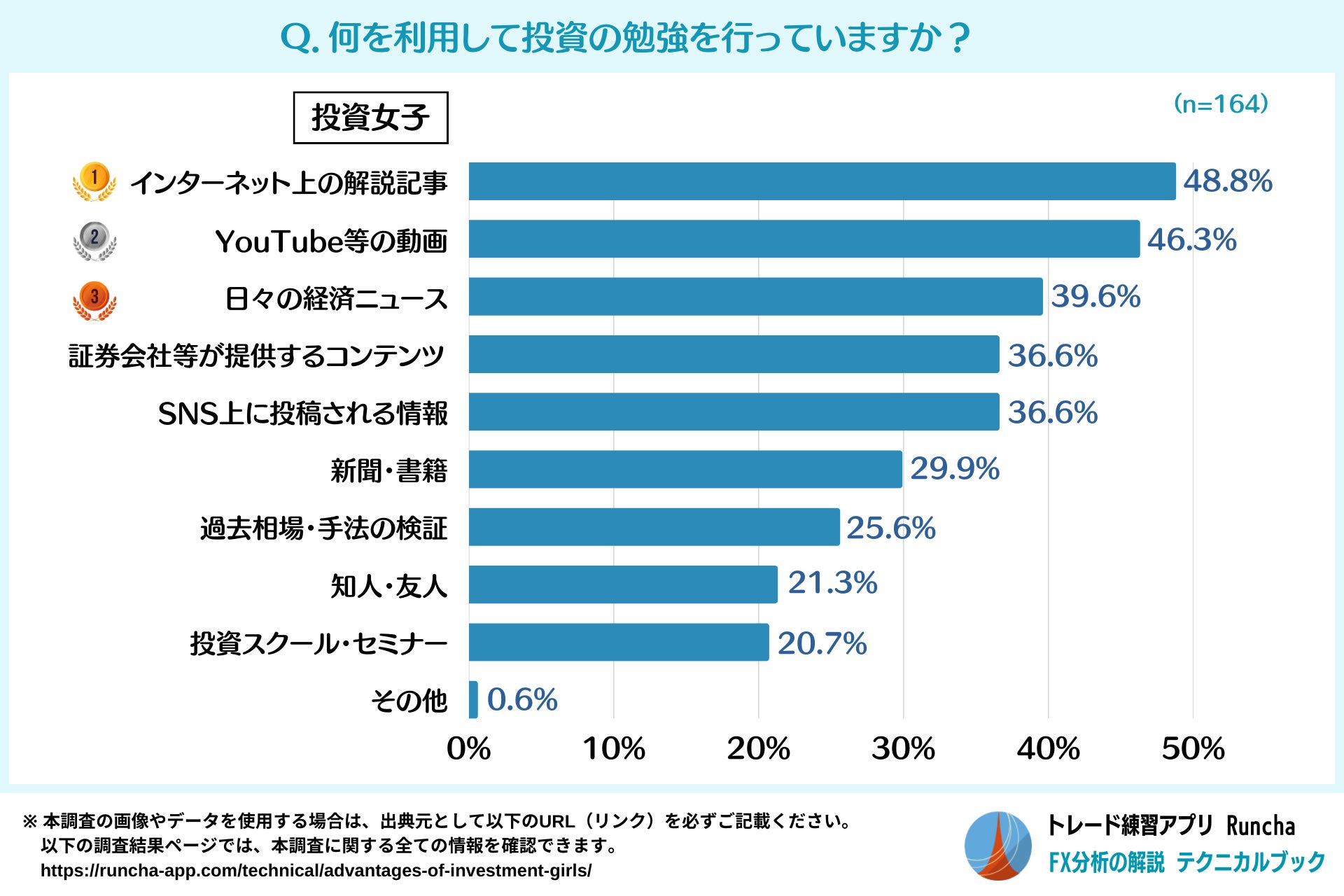 投資の勉強している投資女子を対象に何を利用しているか質問したところ、1位が「インターネット上の解説記事」で48.8%、2位が「YouTube等の動画」で46.3%、3位が「日々の経済ニュース」という結果になりました。