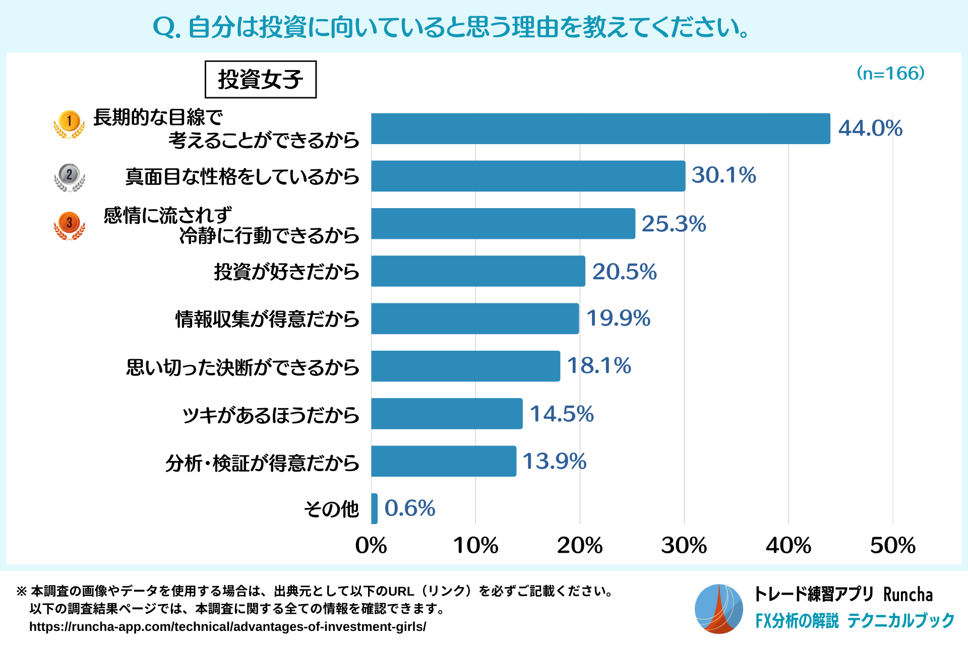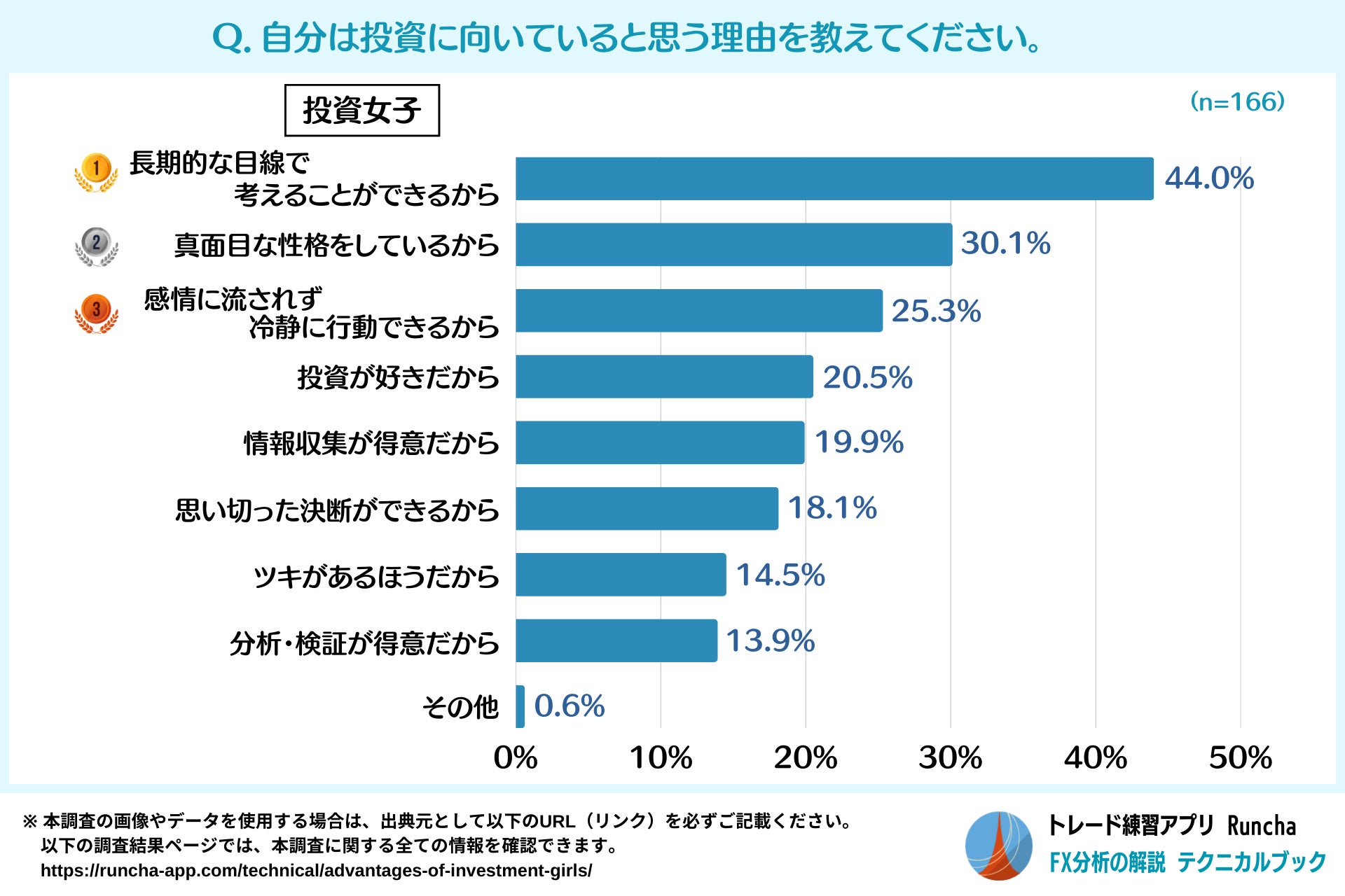 投資に向いている理由で最も多かったのは「長期的な目線で考えることができるから」で、44.0%という非常に高い割合となっています。なお、2位は「真面目な性格をしているから」で30.1%、3位は「感情に流されず冷静に行動できるから」で25.3%でした。