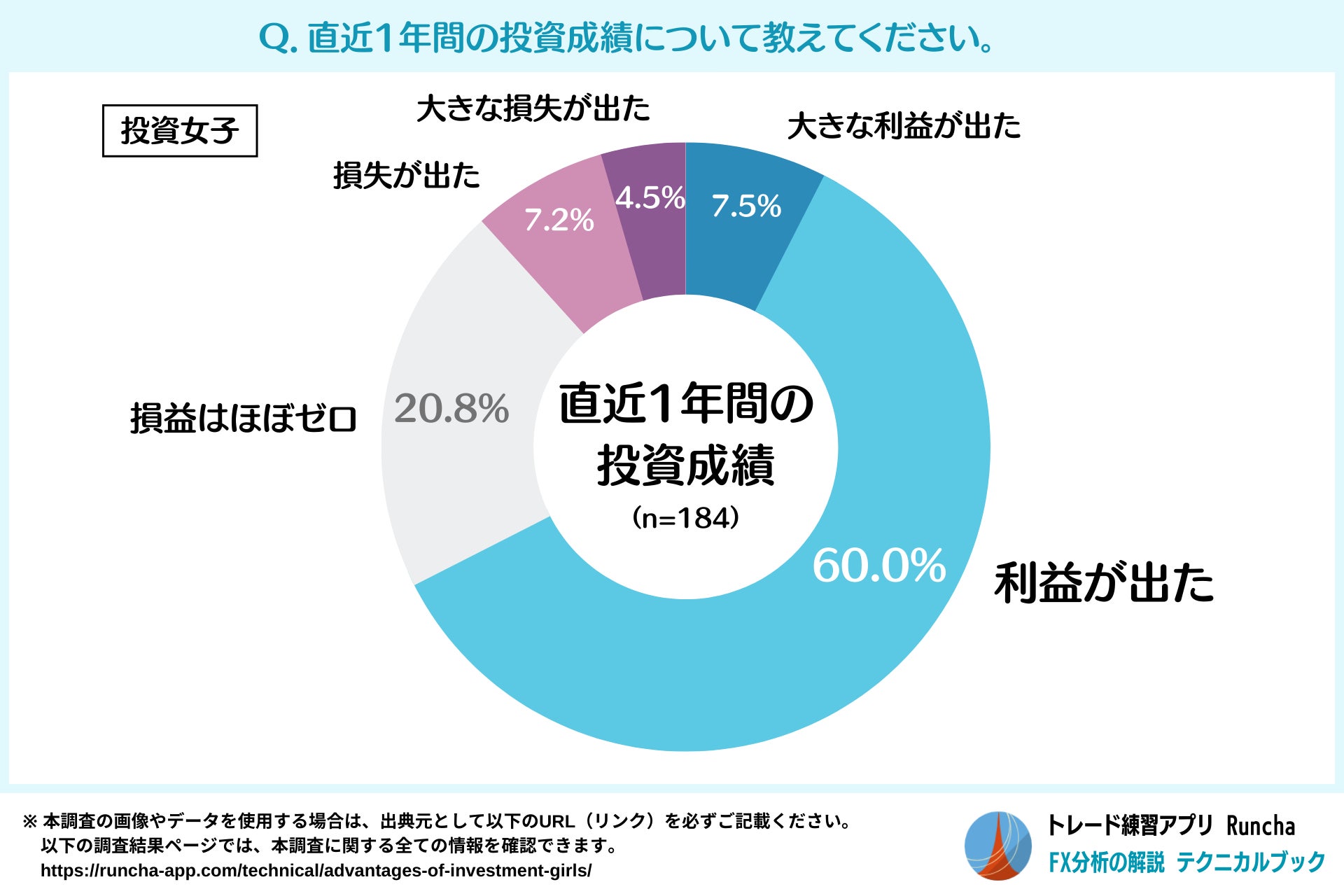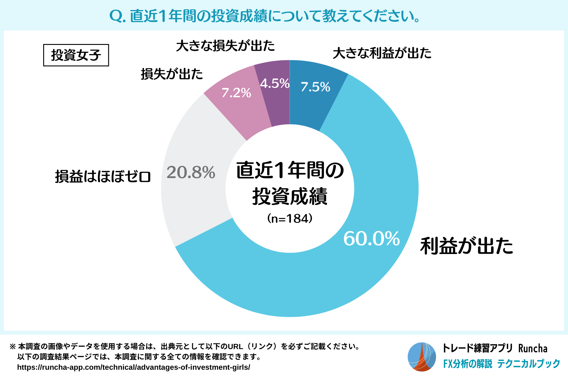 1.直近1年間で利益を出した投資女子は67.5%、損失を出したのは11.7%のみ