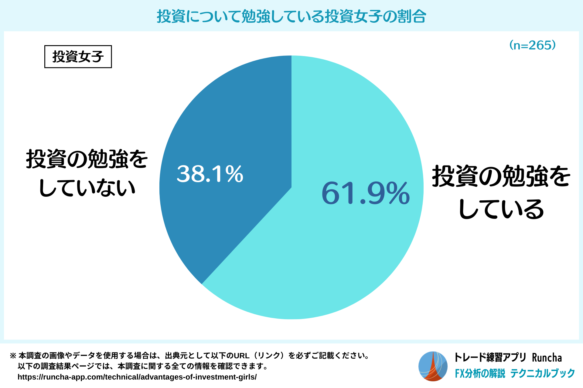 投資女子の投資に関する勉強状況について集計したところ、投資の勉強をしている人は61.9%、投資の勉強をしていない人は38.1%という結果になりました。過半数が投資の勉強を行っているということで、投資女子の真面目な取り組み姿勢が読み取れます。