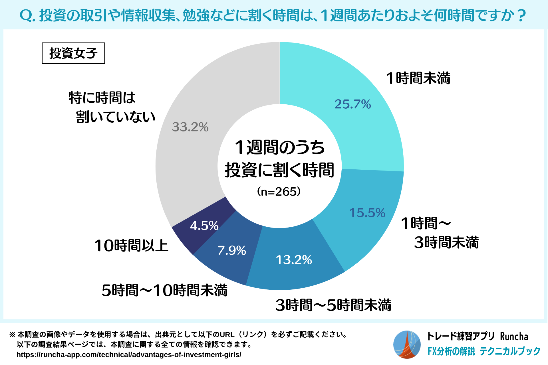 投資に取り組む女性を対象に、1週間のうち投資(取引や情報収集、勉強など)に割く時間を質問したところ、「特に時間は割いていない」と回答した人は33.2%で、投資に何かしらの時間を割いている人は66.8%という結果になりました。