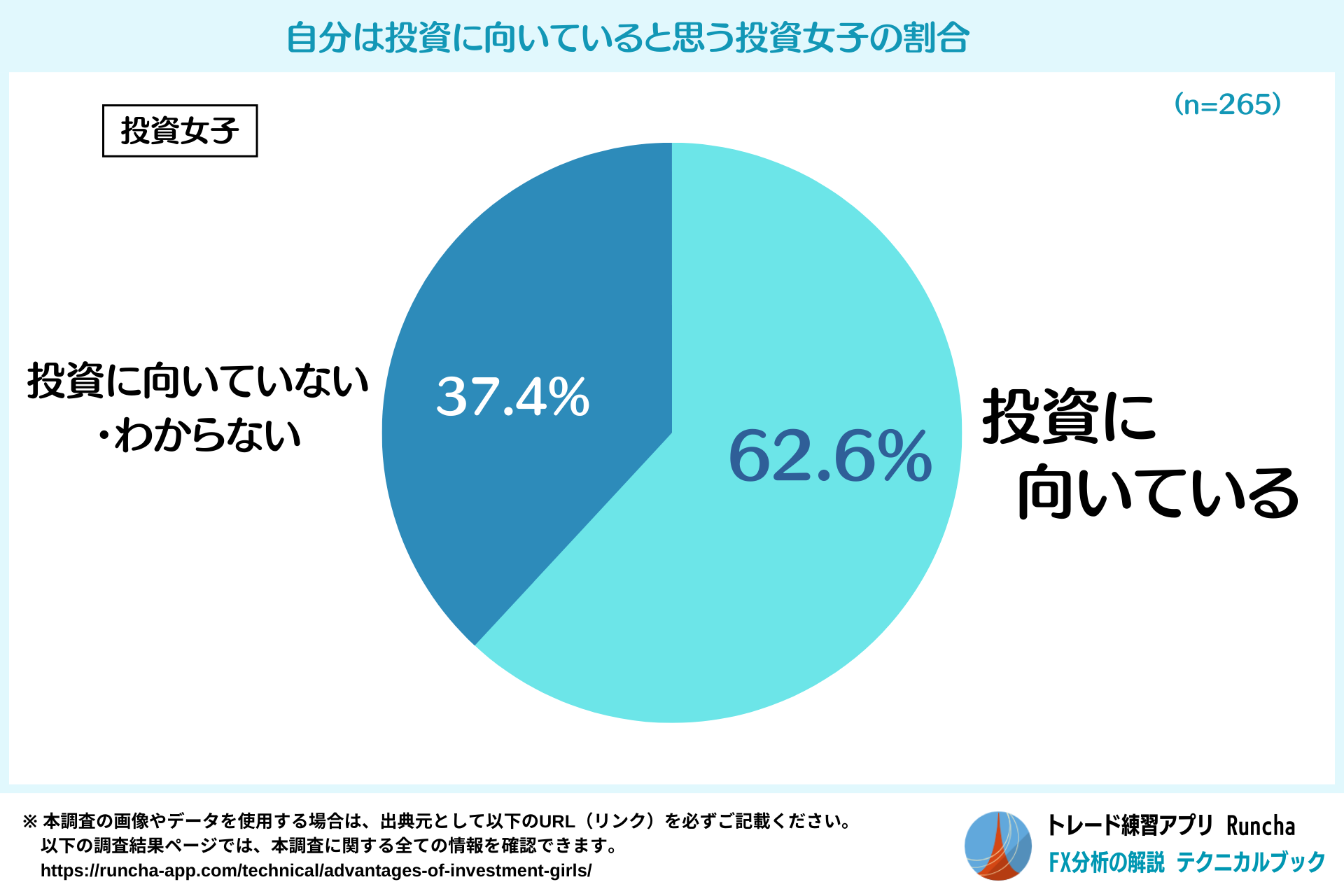 投資女子に自分が投資に向いているか質問したところ、「投資に向いている」と回答したのは62.6%、「投資に向いていない・わからない」と回答したのは37.4%でした。