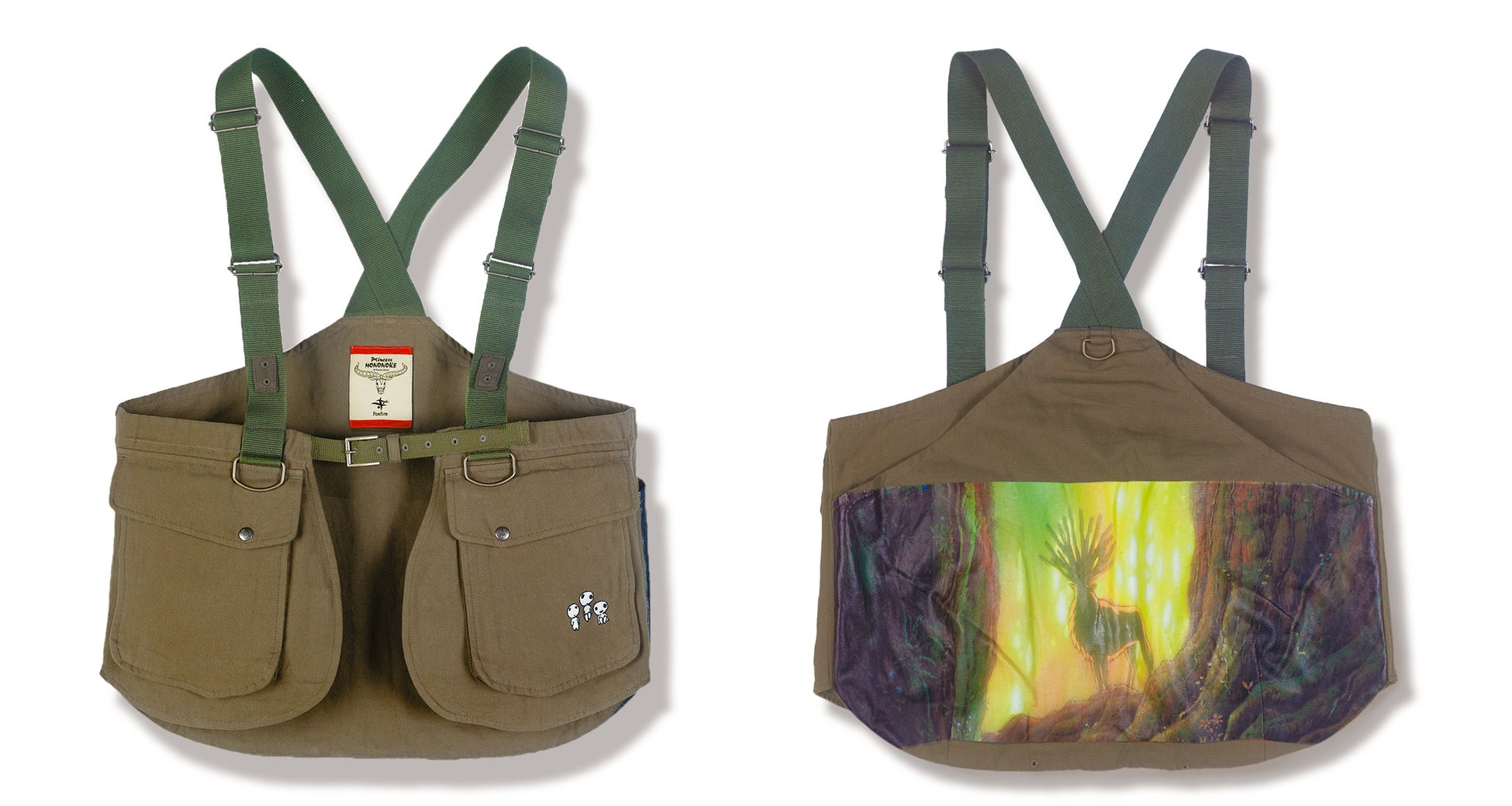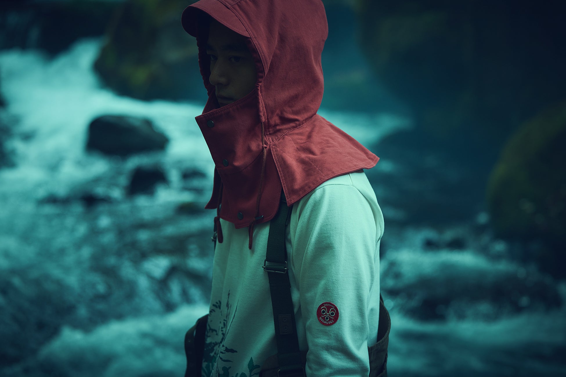 今回のコレクションは、すべてユニセックスで着られるように女性デザイナーが中心となってパターンを起こし、アドバイザーに女優で大のジブリ作品好きでも知られる太田唯さんを迎えて素材選びから配色までを決めていきました。防風透湿性に優れたダウンジャケットや、ヤックルモチーフのショルダーバッグ&トートの裏地には、コラボレーション仕様の特別な柄「フィッシュアイ・もののけカモ」を採用。また、Foxfireの原点であるフィッシングベスト(ツールベスト)の背面には、アシタカがシシ神と邂逅するシーンがプリントされています。