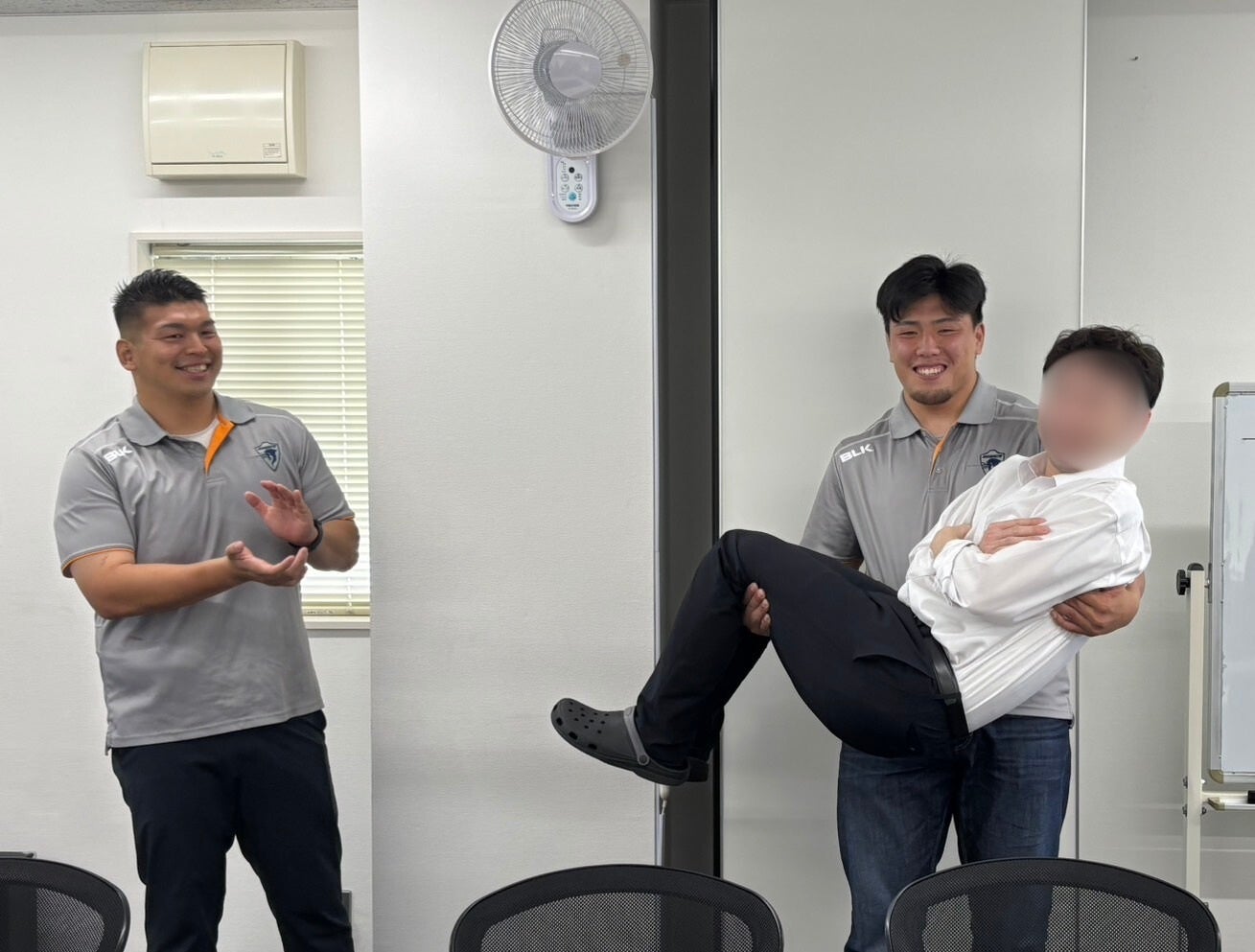 また、男性社員(体重70kg)が選手に軽々とお姫様抱っこされる一幕もあり、社員一同がプロ選手の迫力とフレンドリーな交流を楽しみました。