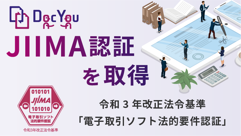 電子契約・電子取引プラットフォーム「DocYou(ドックユー)」は、公益社団法人 日本文書情報マネジメント協会(以下「JIIMA」)が認証する、「電子取引ソフト法的要件認証」を取得しました。