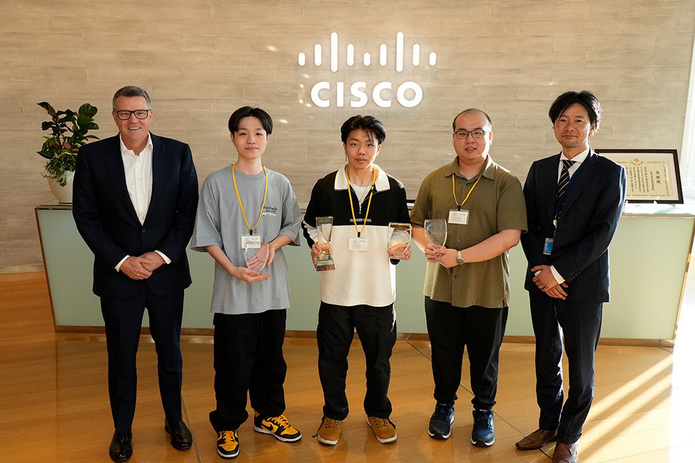去る6月13日(木)に、受賞した学生たちは、シスコシステムズ合同会社 東京本社(東京都港区)で開催された表彰式に招待されました。米シスコシステムズ SVP 兼 グローバルイノベーションオフィサー ガイ・ディードリック(Guy Diedrich)氏が出席し、受賞者一人ひとりに直接トロフィーを授与されました。