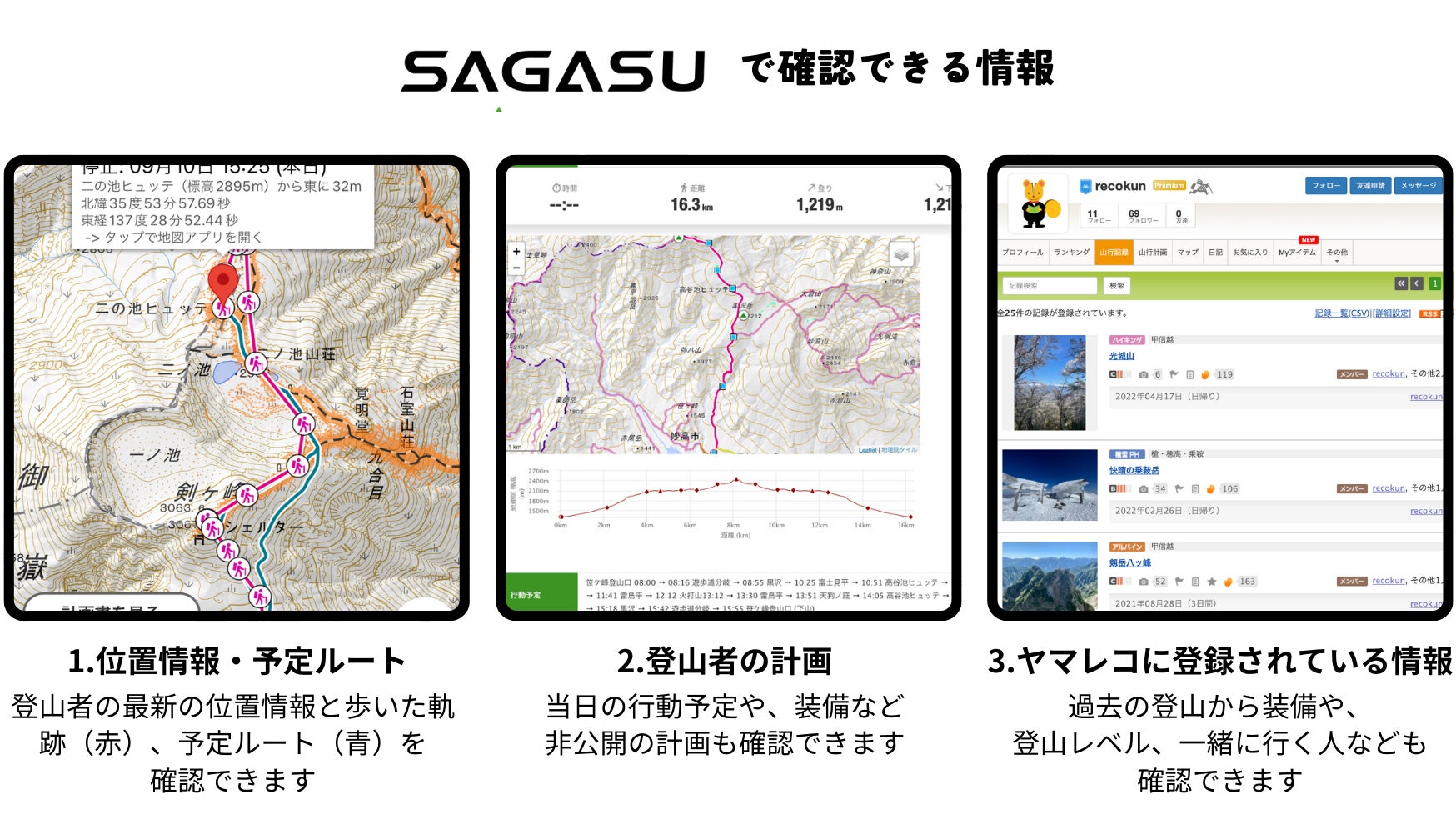 SAGASUとはヤマレコアプリを使っている遭難者を探すシステムです。
