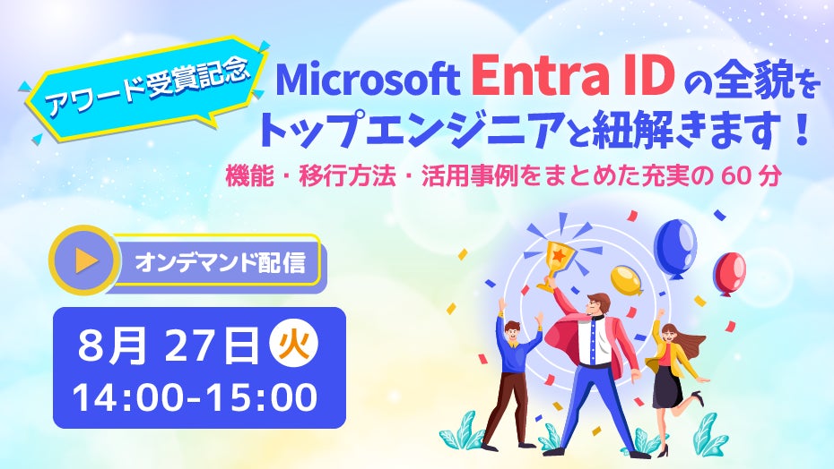 アワード受賞を記念し、当社独自の Microsoft Entra ID 移行支援サービスの紹介と、Microsoft Entra ID の機能や活用事例をご紹介するセミナーを開催いたします。Microsoft Entra ID を中心としたITインフラ形成やMicrosoft 365 の利活用にご興味がある方は是非ご参加ください。