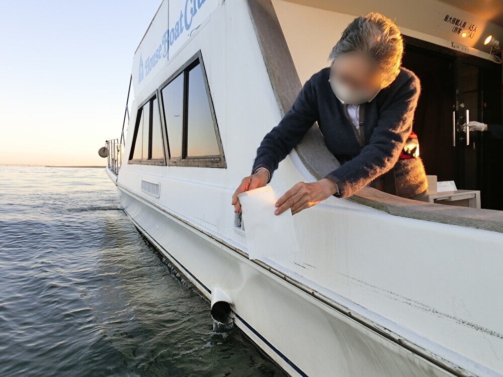 ④ 海洋散骨当日。出航から40分ほどで散骨ポイントへ到着したら、袋を開封し、粉末化したご遺骨を海へ撒きます。海中に白いご遺骨があっという間に広がり、手向けた生花が海面にたゆたいます。