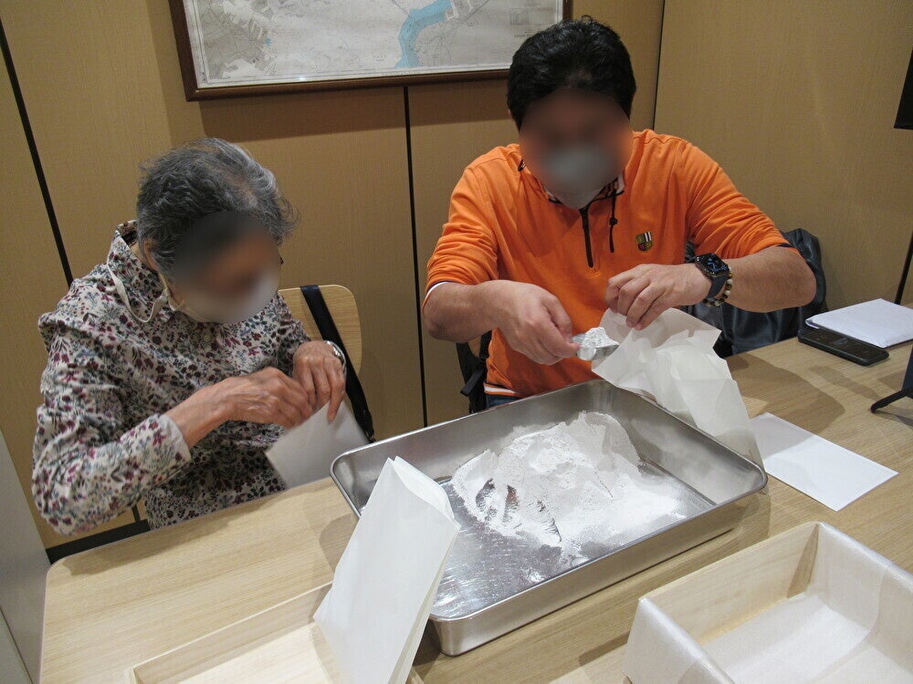 ③ 散骨実施前にご遺骨の粉末化をおこないます。当社の専用粉骨ルームにて、ご家族立会いの下で粉末化。手元供養品や水溶紙袋への納骨もご家族の手でおこないます。