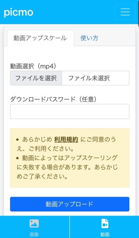 「picmo」のサイトからフリープランのお申込みページに進んでいただき、【画像】または【5分以内の動画】のファイルをアップロードしていただくと簡単にアップスケーリングができます。任意で特定の人だけがダウンロードできるようにパスワードを設定することも可能です。