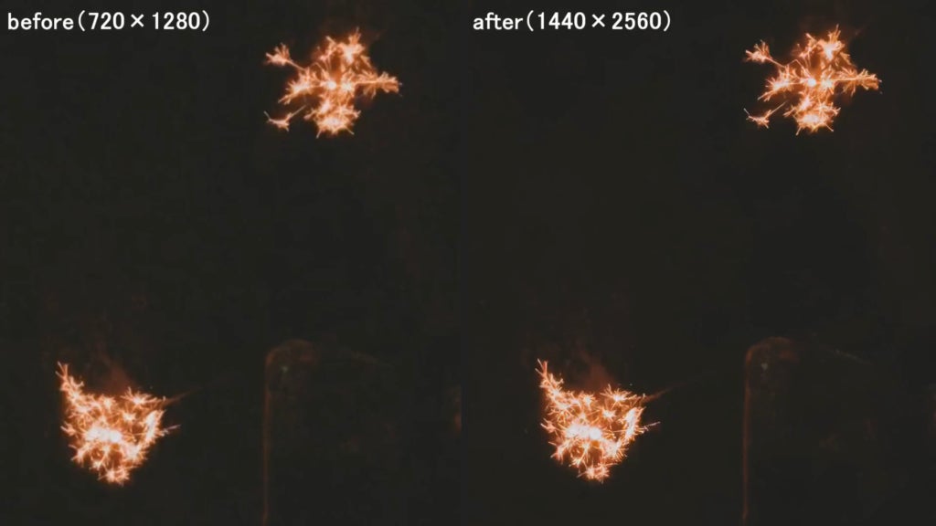 AIアップスケーリングとは、AI(人工知能)を活用して、元々値の存在しない画素間データを作り出すために隣接する画素の値を用いて補間処理するという仕組みです。アップスケーリングした動画は、なめらかに表現された綺麗な動画になります。