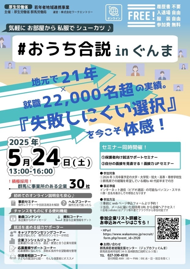 主催である厚生労働省<群馬労働局>の委託を受け、群馬県で21年にわたり国・県の就職支援事業を受託運営し22,000名超の就職実績を誇るワークエントリー(ジョブカフェぐんま受託運営企業)が運営。