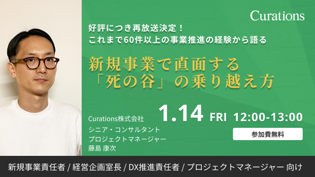 キュレーションズ株式会社(本社:東京都渋谷区、代表取締役社長:根本隆之、以下当社)は、『新規事業で直面する「死の谷」の乗り越え方解説ウェビナー』開催をお知らせします。