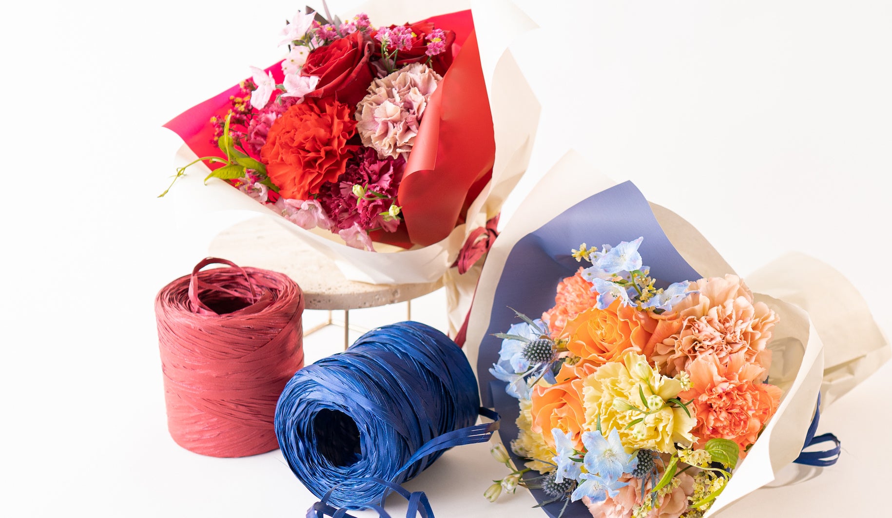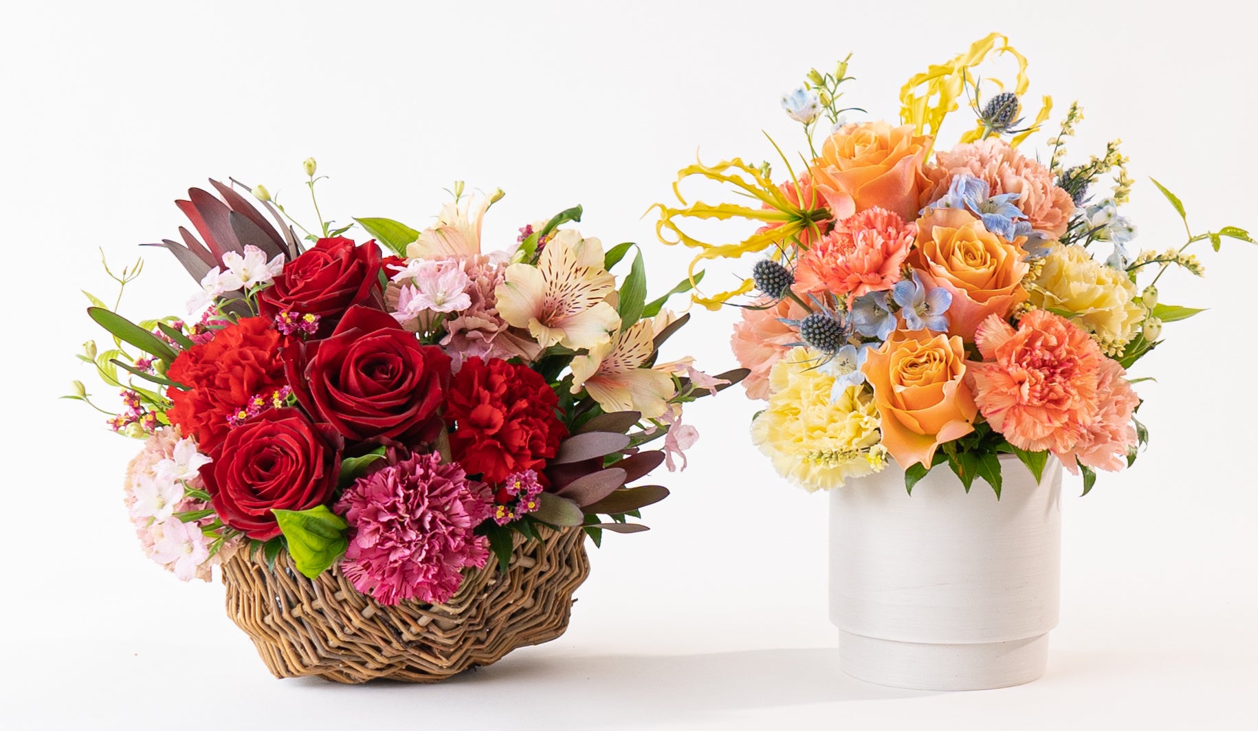 赤色のアレンジメントは、可愛らしさと暖かみを感じられるバスケットで、オレンジ色のアレンジメントは、お花の彩りを引き立てるシックなクリアホワイトの器でお作りします。花束は、主役の花色を引き立てつつ、受け取った時にギフト感を感じられるラッピングにてお届けします。