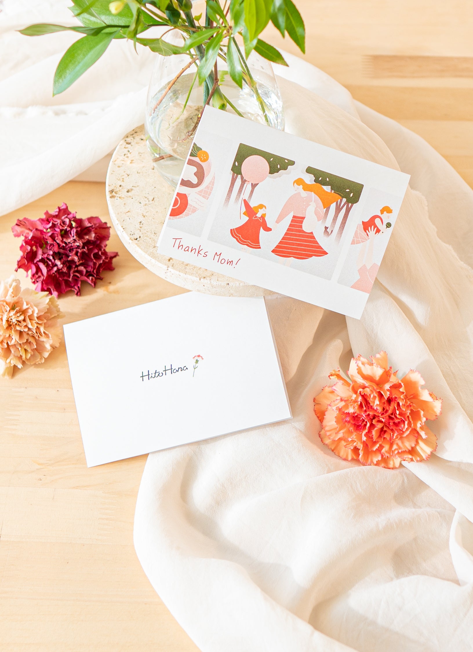 赤いカーネーションやバラを使用した定番のデザインや、オレンジベースのビタミンカラーデザインなど。"想い出"をイメージした限定デザインのカードを添えて、HitoHanaでしかできない母の日体験を。