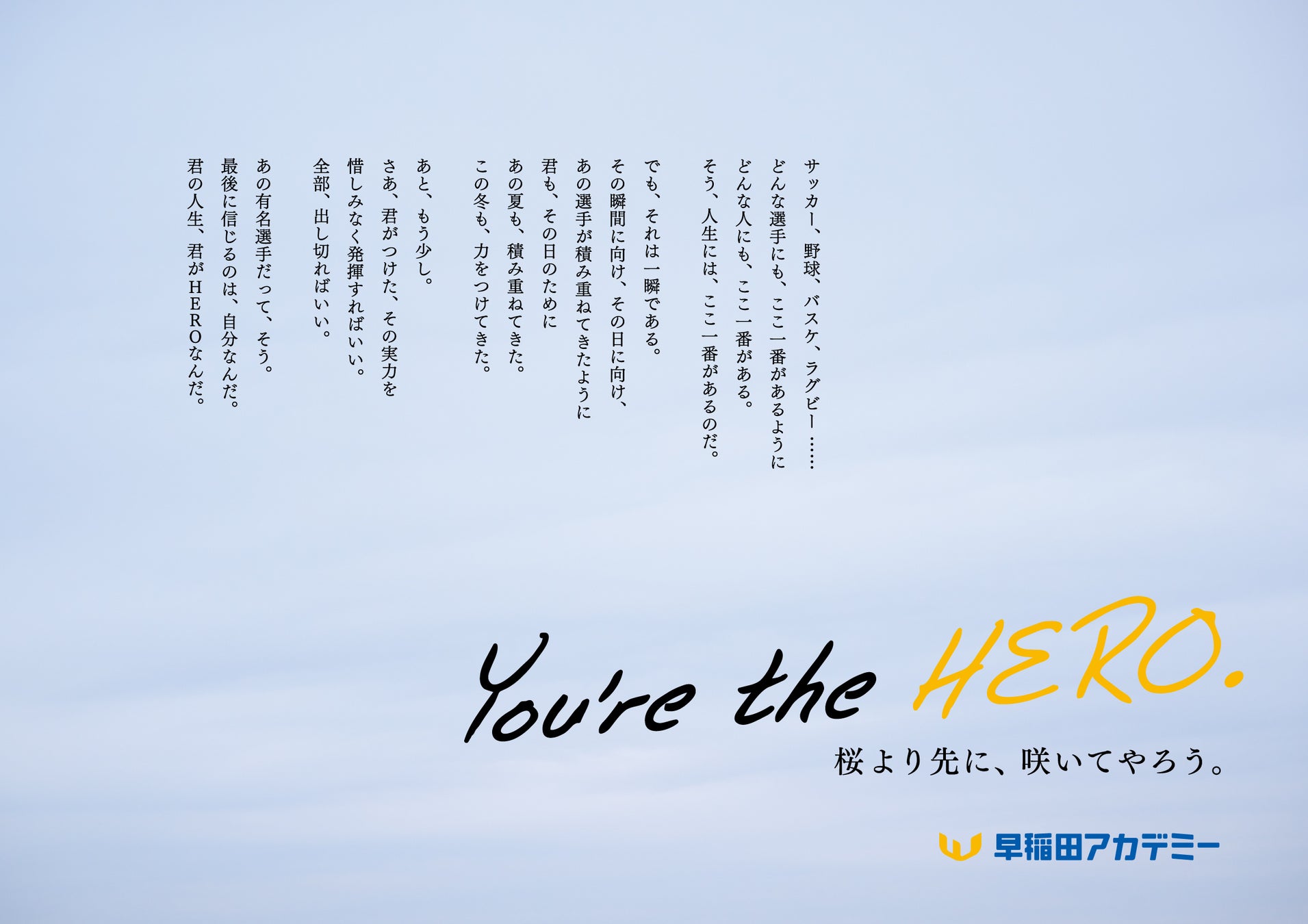 サッカー、野球、バスケ、ラグビーなど、2023年はさまざまなスポーツで“HERO”が誕生しました。世界中から賞賛される姿は、自分とはかけ離れた特別な存在のように映ったかもしれません。しかし、舞台は違っても、自分で決めた目標のためにひた向きに努力を積み重ねてきた事実は、世界で活躍する選手たちも、受験生たちも同じ。早稲田アカデミーはこの広告を通して、入試本番という“ここ一番”を迎える受験生一人ひとりへ、心からのエールを送ります――「You’re the HERO.」。