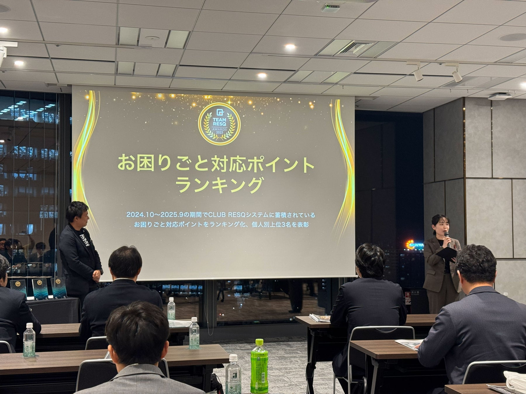 「TEAM RESQ AWARDS」は、レスQセンターネットワークの全国大会です。全国で入居者のお困りごと対応を行う“レスQ隊員”が一堂に会し、各社の成功事例や取り組みをプレゼンテーション形式で共有、投票によって日本一を決定します。