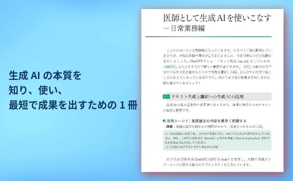 株式会社医学書院 (所在地:東京都文京区 代表取締役社長:金原 俊)は、書籍『医師のための生成AI超活用術-本質を知り使いこなす』(著:三澤 将史)を2026年4月6日に発売しました。