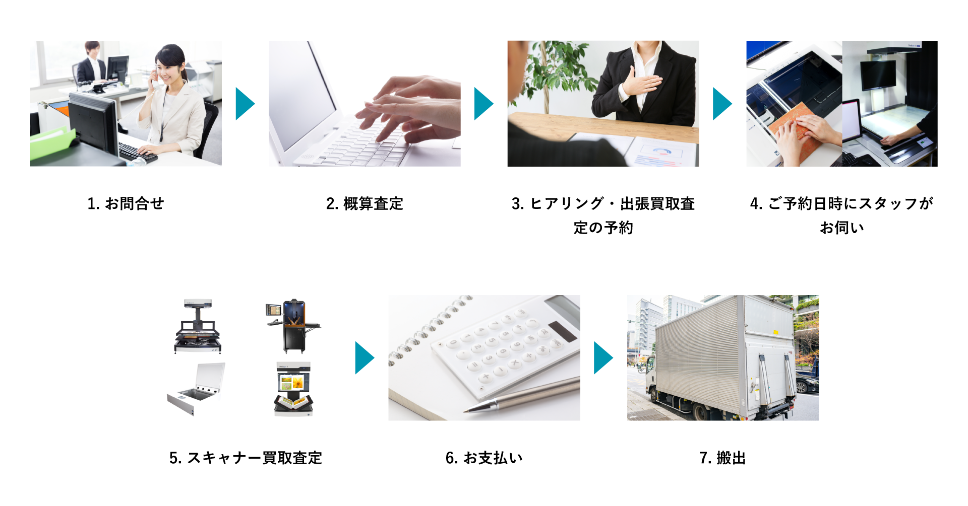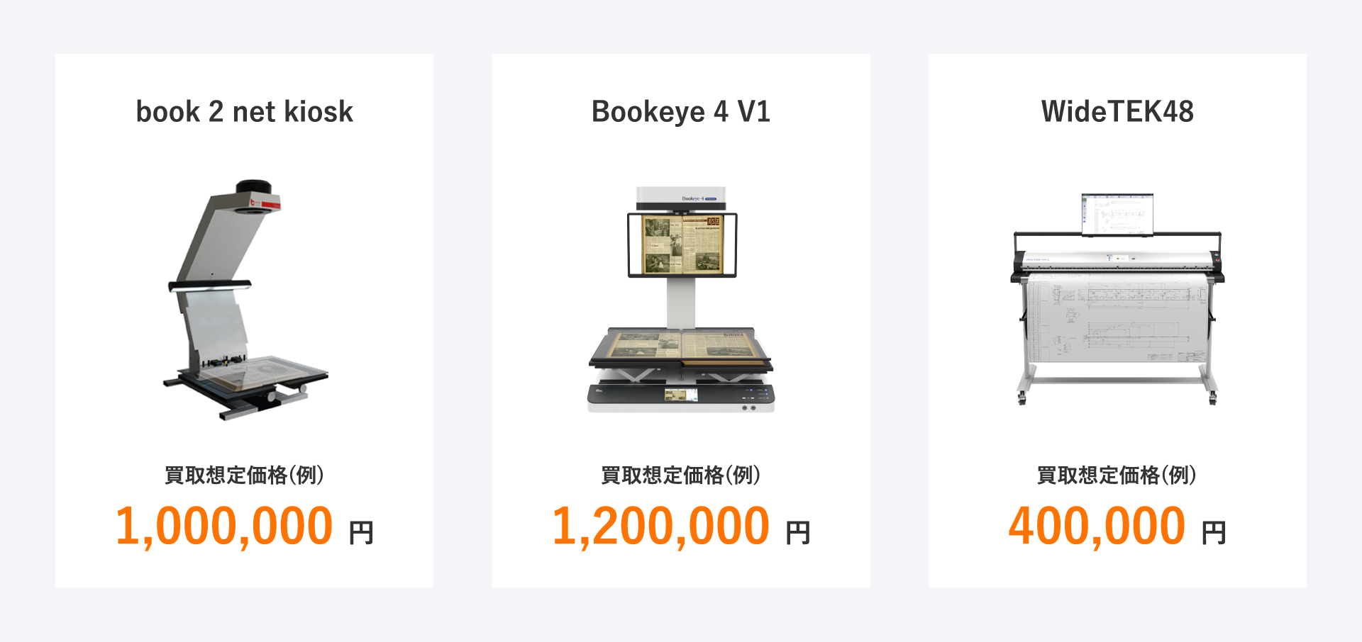 「デジタルアーカイブ専用スキャナー買取サービス」では、概算査定、現地査定、搬出までワンストップで対応します。お気軽にご相談ください。