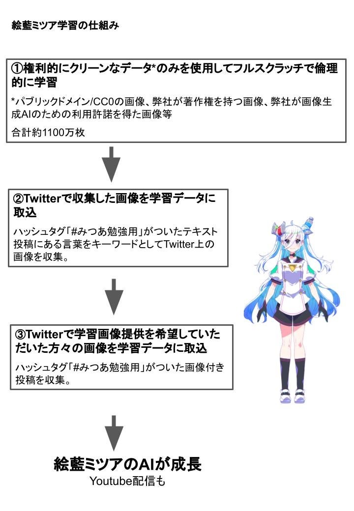 この学習プロセスは逐次繰り返され、絵藍ミツアのAIは、どんどん成長していきます。このようにして学習されたモデルは絵藍ミツアの活動(YouTube/Twitter他SNSにおける活動を含みます。)に関連する目的及び当社の研究活動の目的のためにのみ使用されます。
