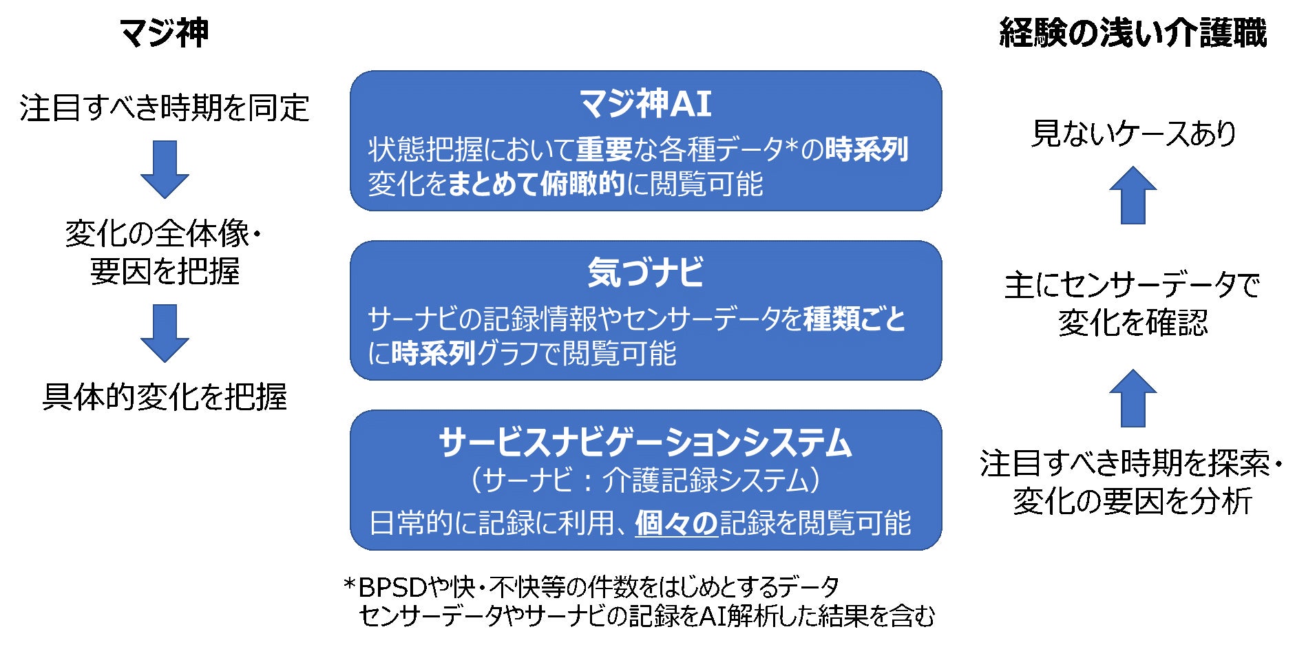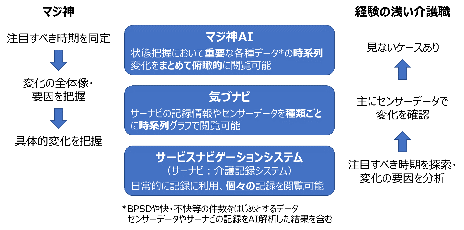 経験の浅い介護職が「マジ神AI」を活用することによって、多角的に情報収集する「マジ神」に近づけると示唆