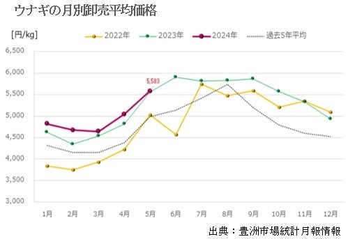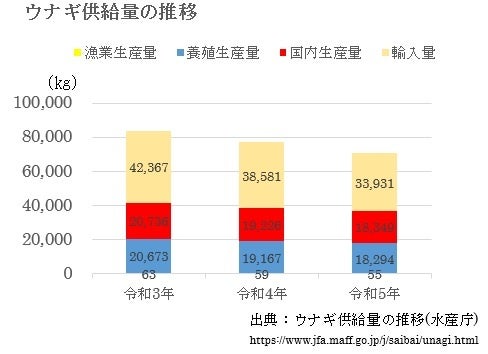 うなぎの国産生産量は3年前から比較すると12%減と年々減少している傾向が見られ、平均単価は年々上昇しています。また、ウナギ(活)の輸入量は昨年と比較し、3.0%減少※していますが、円安の影響もあり平均単価は5.3%(172円)高騰※しています。