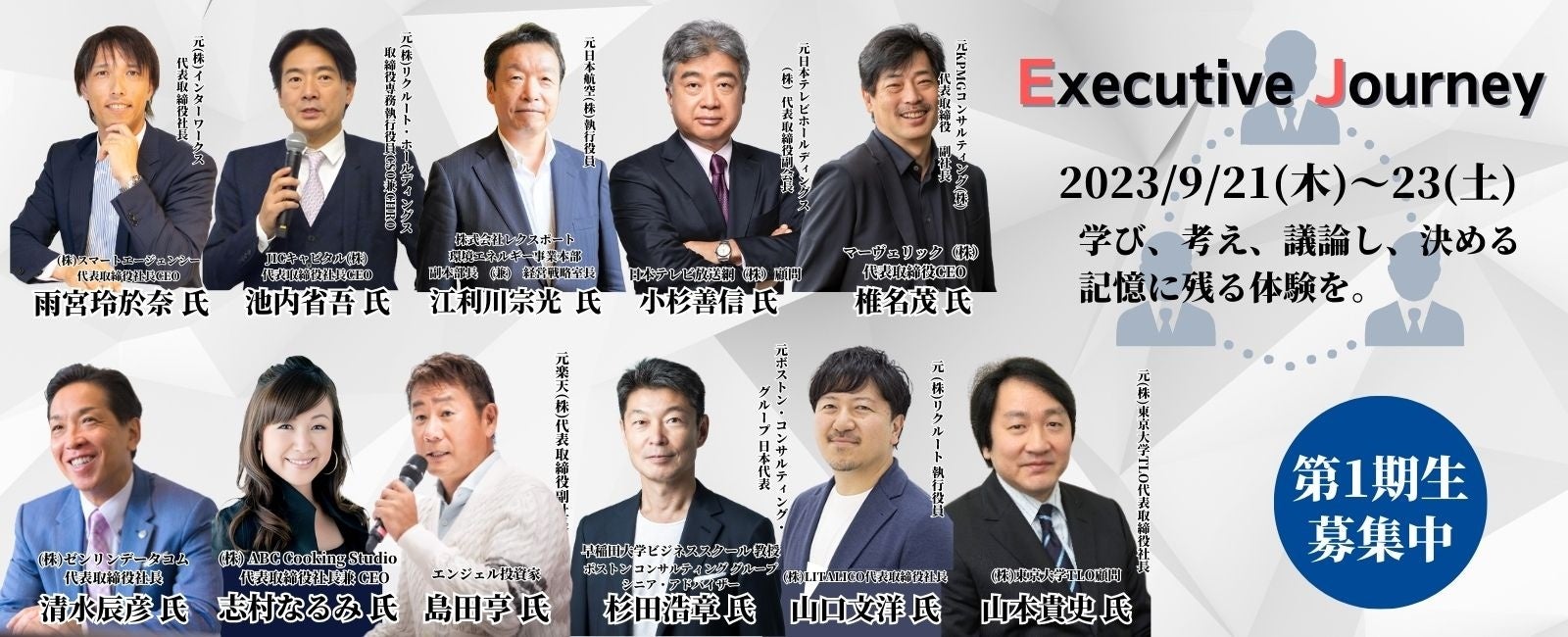 ⽇本経済を牽引している地⽅企業はまだまだ少ない。であれば私たちが、⽇本を牽引する地⽅企業が⽣まれる原動⼒を作ればいい。EXECUTIVEJOURNEY。地⽅から⽇本を牽引する経営者を育てるために、上場企業の役員・経営者、若⼿起業家、NPO 代表、スポーツや芸能などのプロフェッショナルといった様々な⽅々が志に賛同し集まってくださいました。刺激のシャワーを受ける⼆泊三⽇のスペシャルな体験。