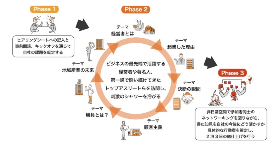 「地域の元気が、⽇本の元気に繋がる。」というコアバリューのもと、⼀流経営者をはじめとする著名⼈、経済⼈と対話でき、地⽅で経営を担っていく意思を⾼めることができる 2 泊 3 ⽇のツアーを開催します。プログラムの中では、都内の企業⾒学や、⻄湖でのアクティビティ、トークセッションなども予定しております。