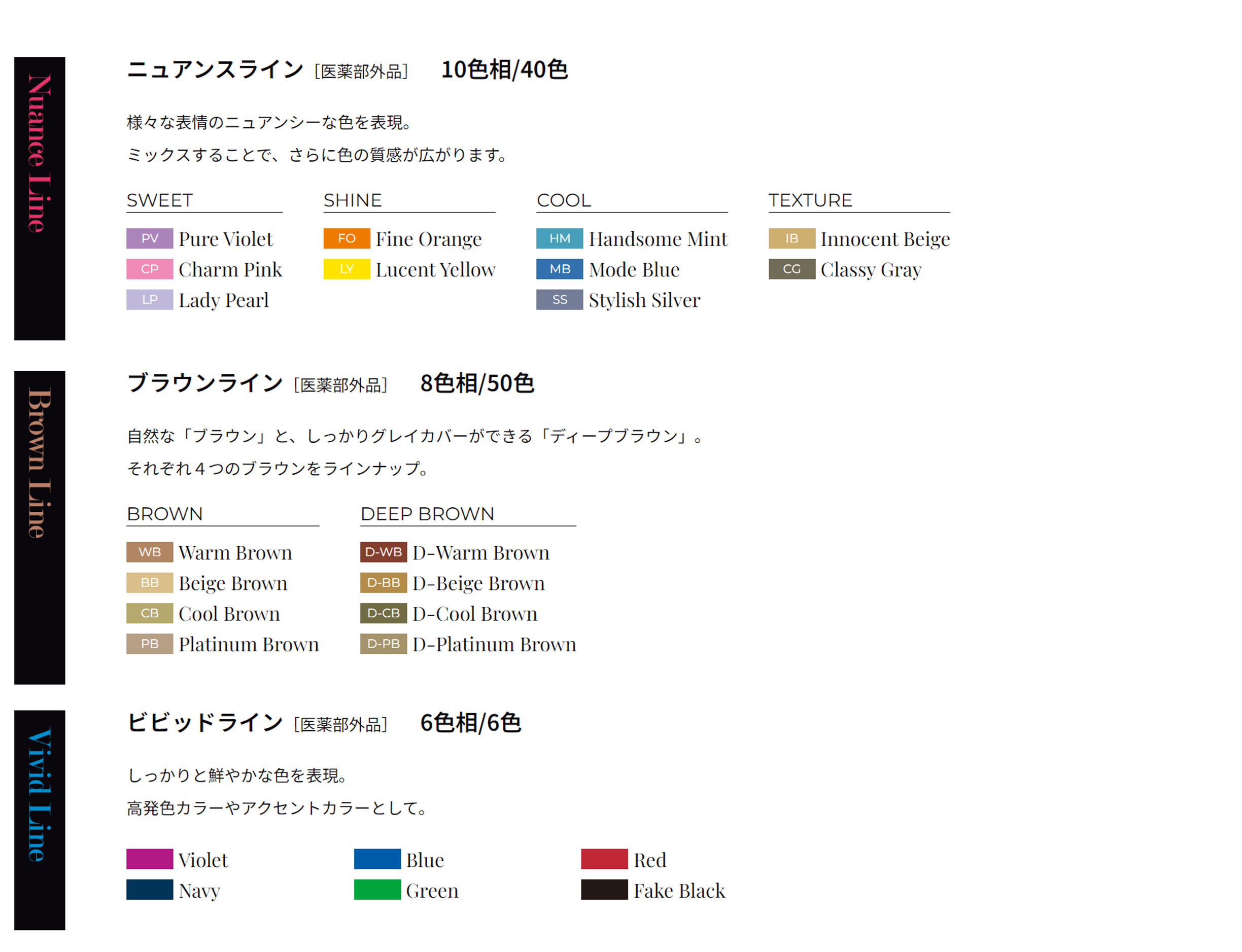 最小で最大の色味を表現できる「ニュアンスライン」「ブラウンライン」「ビビッドライン」をラインナップ。ニュアンスカラーからグレイカラ―まで、デザイン提案の幅が広く、様々なお客様のご要望にお応えできる96色のラインナップとなっています。