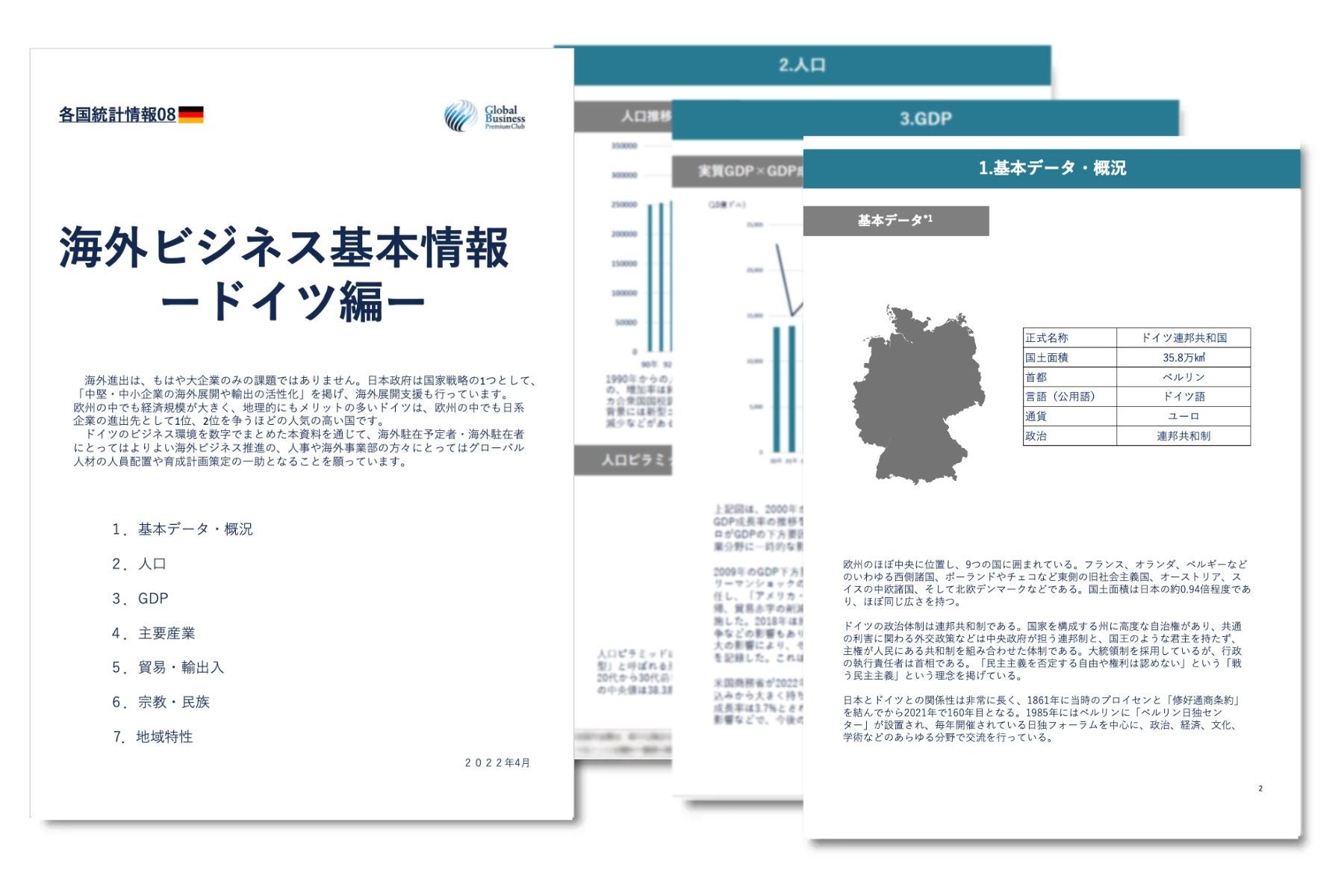 ドイツへの海外進出を検討中の企業へ、市場調査の第一歩に必要となるビジネス環境(人口、GDP、主要産業、貿易・輸出入、宗教・民族/人種、地域特性)に関するレポートをまとめました。