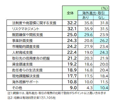 特に、海外に進出していない企業では、「事業計画支援」や「人材育成支援」が海外ビジネスを行う企業と比較して高く、新たに海外事業を進めるための準備に関する支援サービスを期待している様子が表れた。