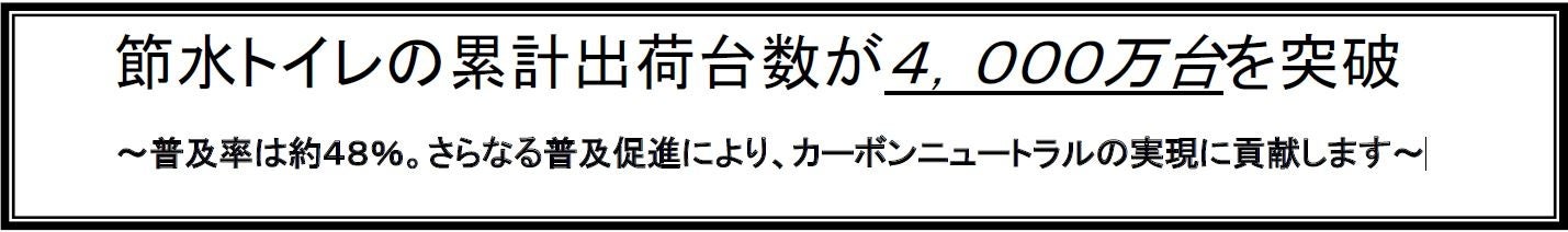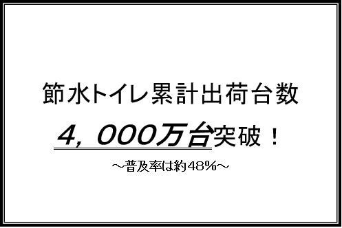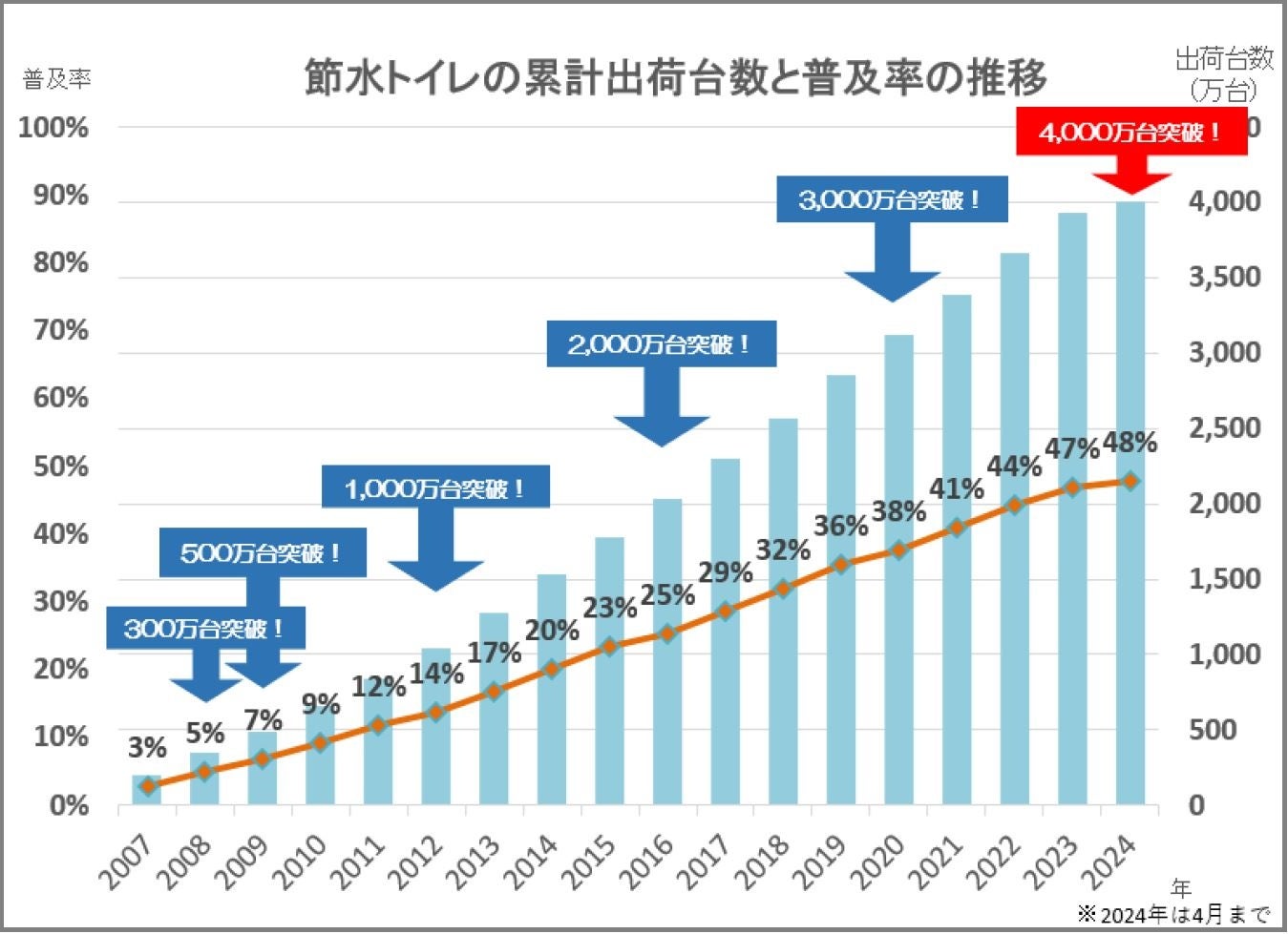 一般社団法人 日本レストルーム工業会(本部:愛知県名古屋市、会長:清田 徳明(TOTO株式会社 代表取締役 社長執行役員))では、このたび洗浄水量が6L以下のトイレ(以下「節水トイレ」という)に関する出荷統計調査を実施しました。その結果、2024年4月に節水トイレの出荷台数が累計で4,000万台を突破したことが確認できました。