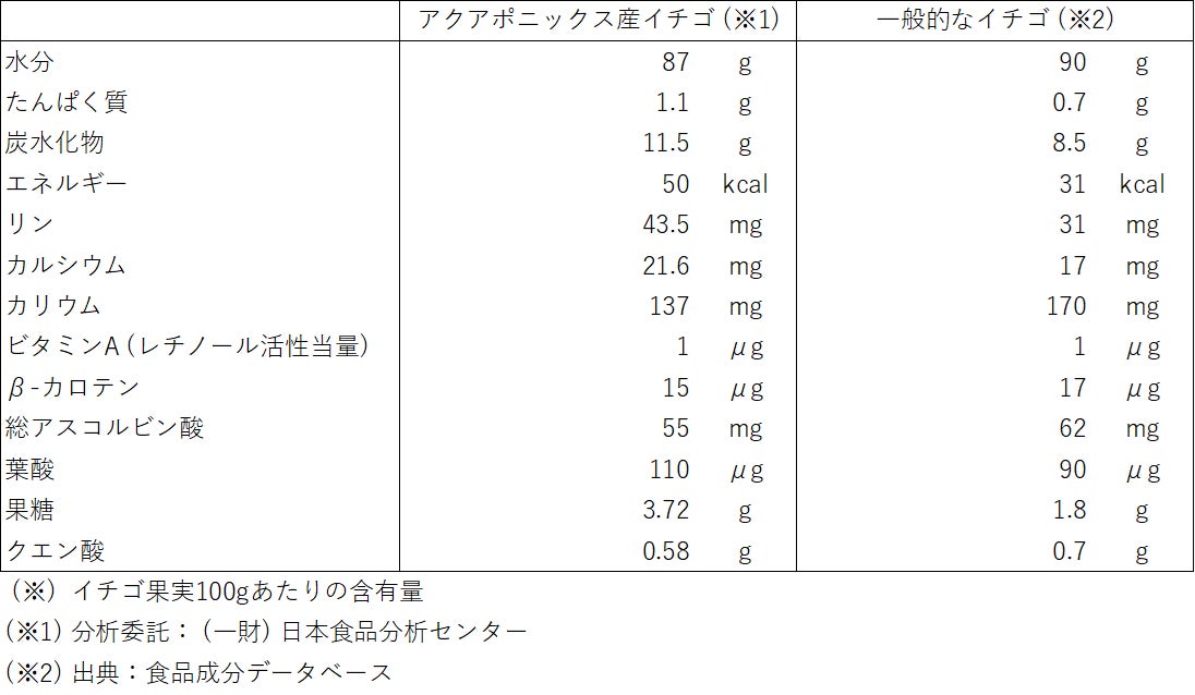 一般的なイチゴは平均糖度が10度程度であるのに比べ、アクアポニックス産イチゴは平均糖度が15度と、より甘いイチゴが生産できることが確認されています。