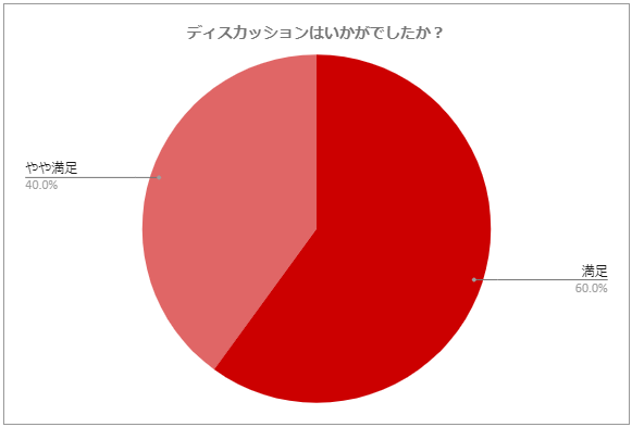 集計結果を見て1名だけ「やや不満」という方が気になっていたのですが、詳細データ見る限り、時間が短い、アイデアを聞くだけで具体的な企画の話ができなかった、というところが理由になっており、会自体への不満でなく、意識が高いからこそのご意見だと思いました。