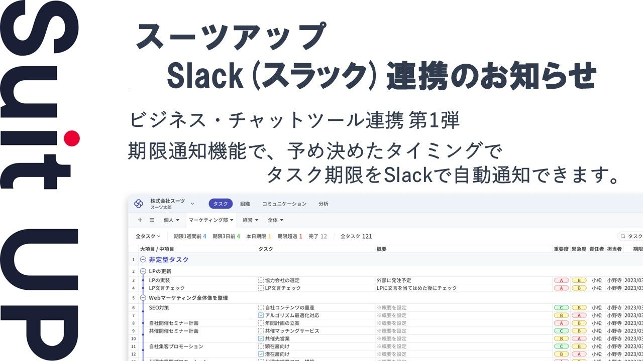 この度、株式会社スーツ(所在地:東京都千代田区、代表取締役社長CEO:小松 裕介)は、チームでかんたん、毎日続けられるプロジェクト・タスク管理ツールの経営支援クラウド「Suit UP」(スーツアップ)がビジネス・チャットツール「Slack」と連携したことをお知らせします。