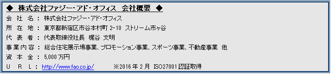 ◆株式会社ファジー・アド・オフィス 会社概要◆ 会 社 名:株式会社ファジー・アド・オフィス 所 在 地:東京都新宿区市谷本村町2-10ストリーム市ヶ谷 代 表 者:代表取締役社長 梶谷 文明 事業内容 :総合住宅展示場事業、プロモーション事業、スポーツ事業、不動産事業 他 資 本 金:5,000万円 U R L :http://www.fao.co.jp/ ※2016年2月 ISO27001認証取得 |